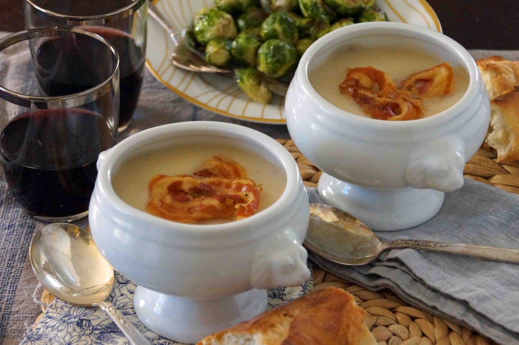 This celery root soup seems like the type of thing a cooking magazine would suggest as an elegant way to begin your family’s Thanksgiving feast. I can picture it, served tableside out of a gorgeous soup tureen, as a family of beautiful people gather around a beautiful fall table. The mood is festive, but serene. They’re all so happy just to be spending the holiday together.