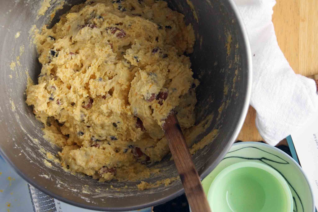 Fold in the almonds and currants and your biscotti dough is complete. Don’t be alarmed–it should be that wet and sticky!
