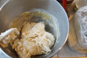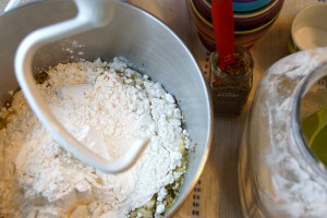 Add flour and mix until a scraggly, wet ball of dough forms.