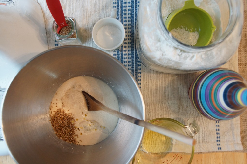Dissolve the yeast in warm water and let it sit until it looks thick, creamy, and slightly bubbly. Add more water, salt, olive oil, and anise seeds. You probably think you don’t like anise. Give it another try; it’s subtle and I promise your bread won’t taste like black licorice. If you still don’t buy it, play it safe and make rosemary focaccia instead.