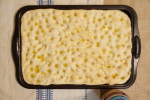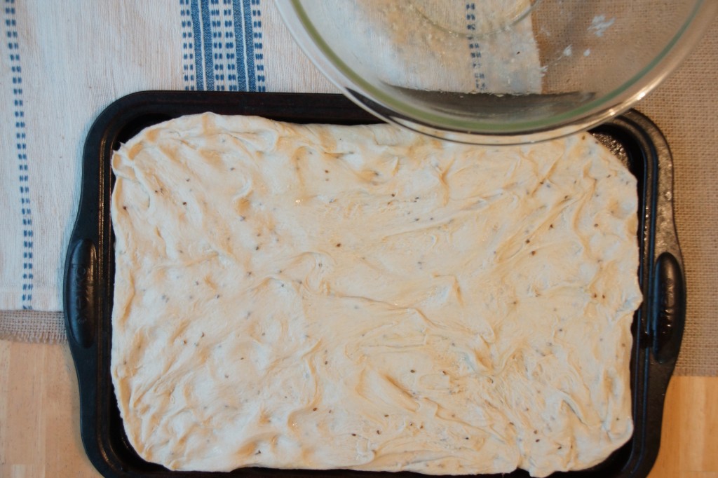 - Turn the dough out onto an oiled sheet pan. Stretch the dough to fit the pan, cover, and allow to rise for another hour.