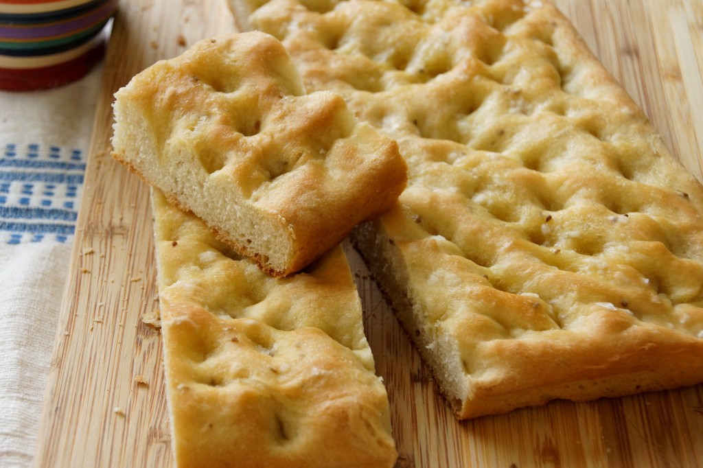 - Using your fingertips, make indentations all over the top of the focaccia. Drizzle liberally with olive oil and sprinkle with sea salt. Bake until golden, about 20 minutes. Focaccia is best served warm.