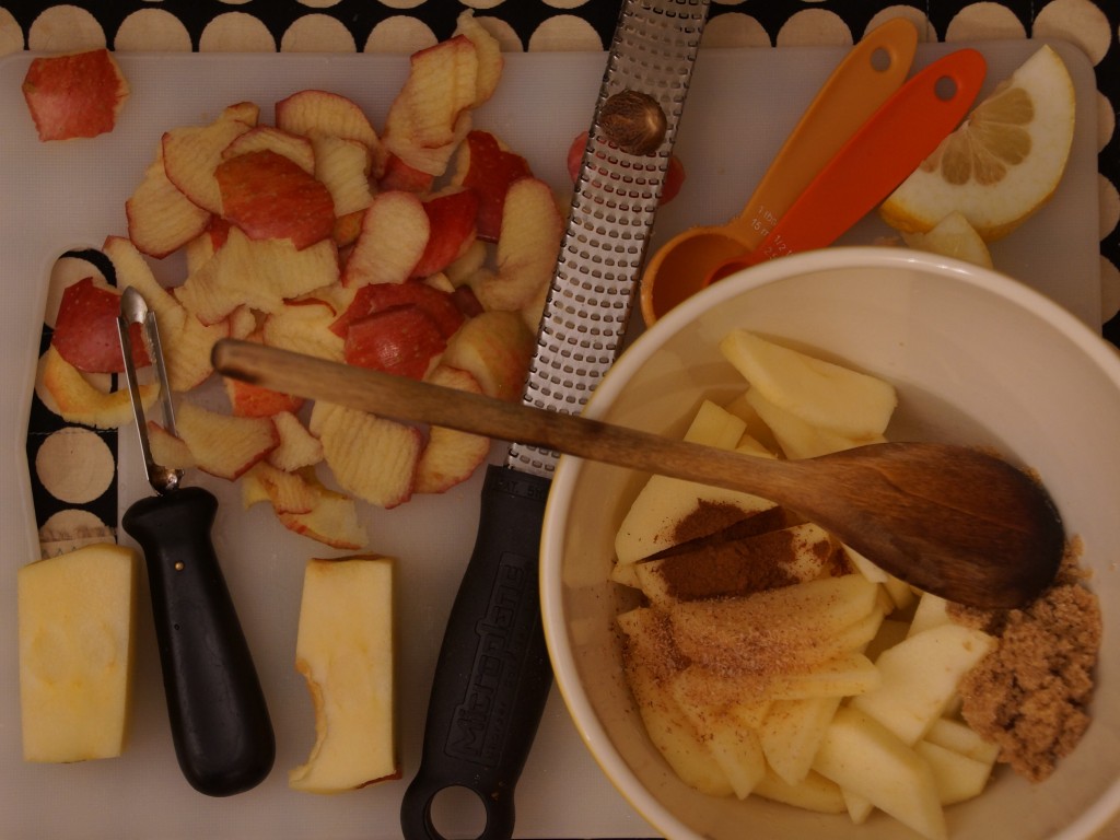 Prep the filling- almost as easy as opening a can- peel and slice apples, toss with sugar and spice.