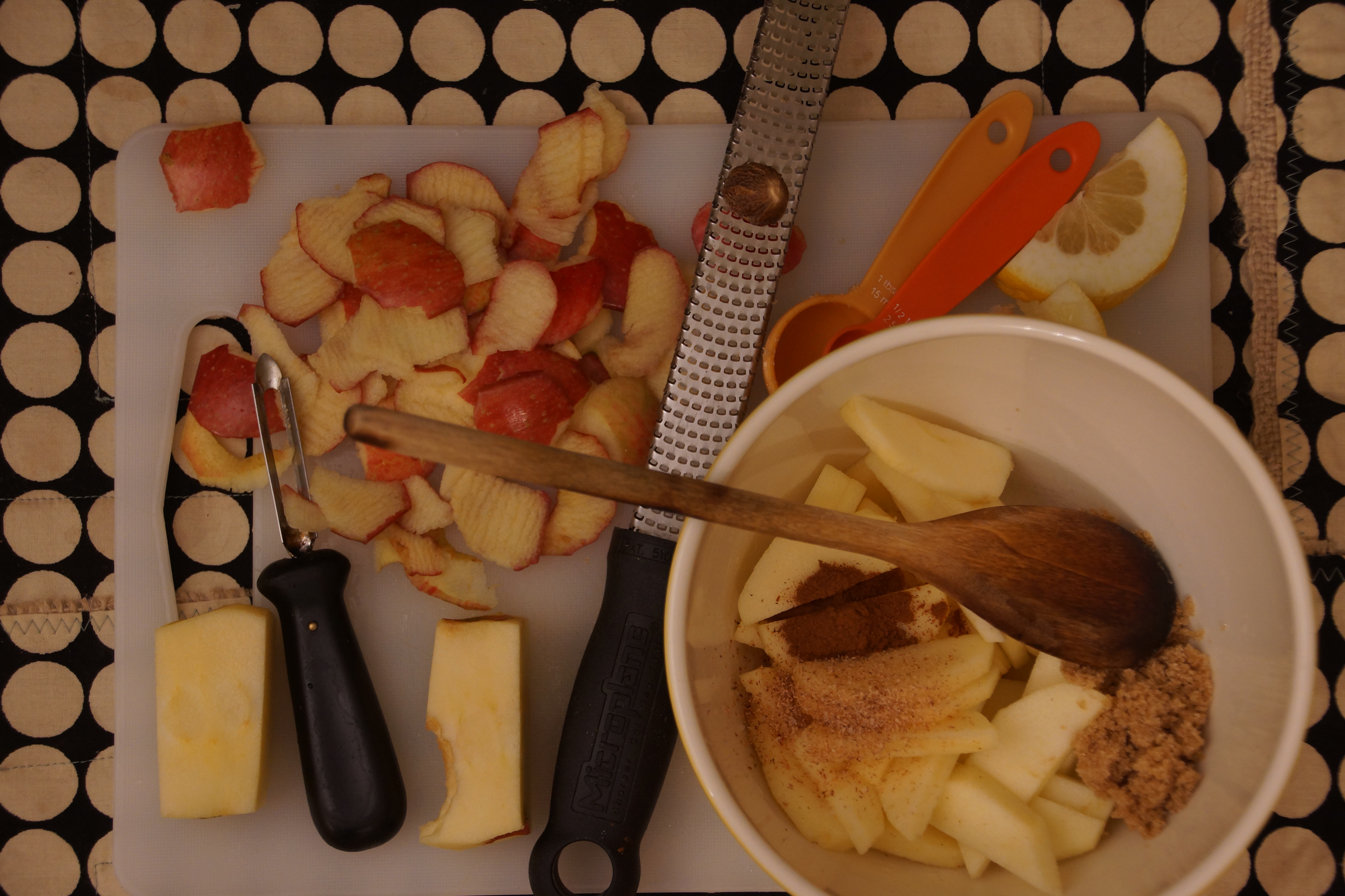 - Toss sliced apples with lemon juice, spices, and brown sugar. Set aside.