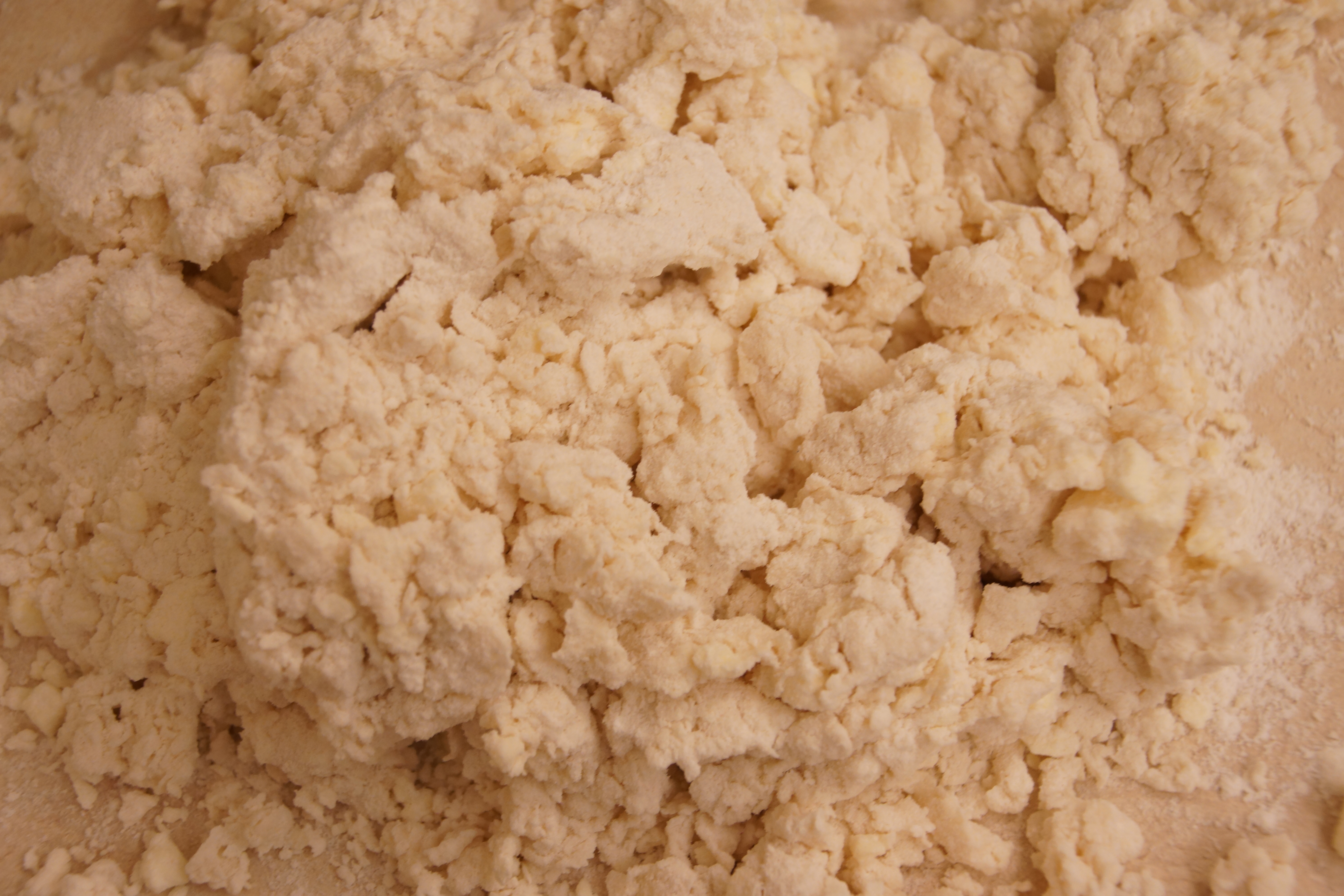 Cut butter into dry ingredients. Pour in buttermilk, stir just long enough to bring it all together into a soft dough.