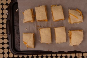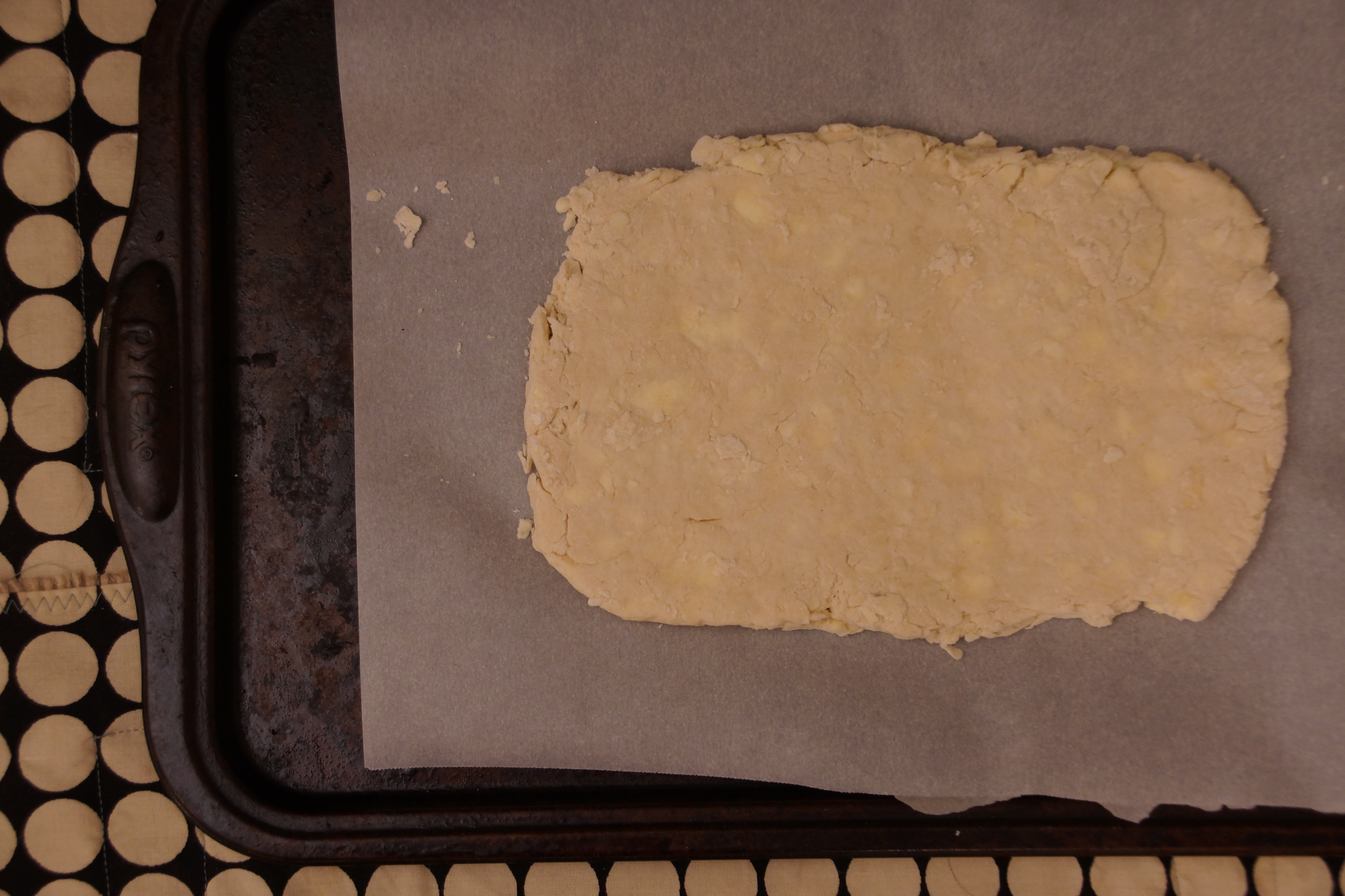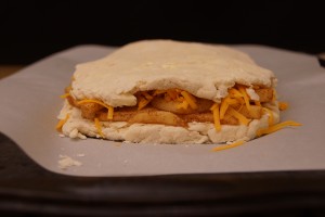 - Divide the dough in slightly uneven halves. Using the larger half first, roll out a rectangle, about 8 in by 12 in. Spread apples slices over the biscuit dough, leaving the accumulated juices in the bowl. Sprinkle with about ¾ c. of grated cheddar. Roll remaining biscuit dough into a slightly thinner rectangle of the same dimensions. Place this on top of the apple slices and cheddar. Carefully cut into 8 pieces and pull the individual biscuits apart to allow for even baking. Sprinkle with remaining cheddar.