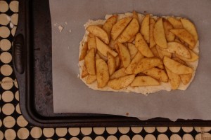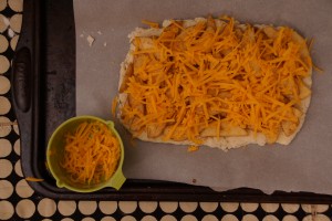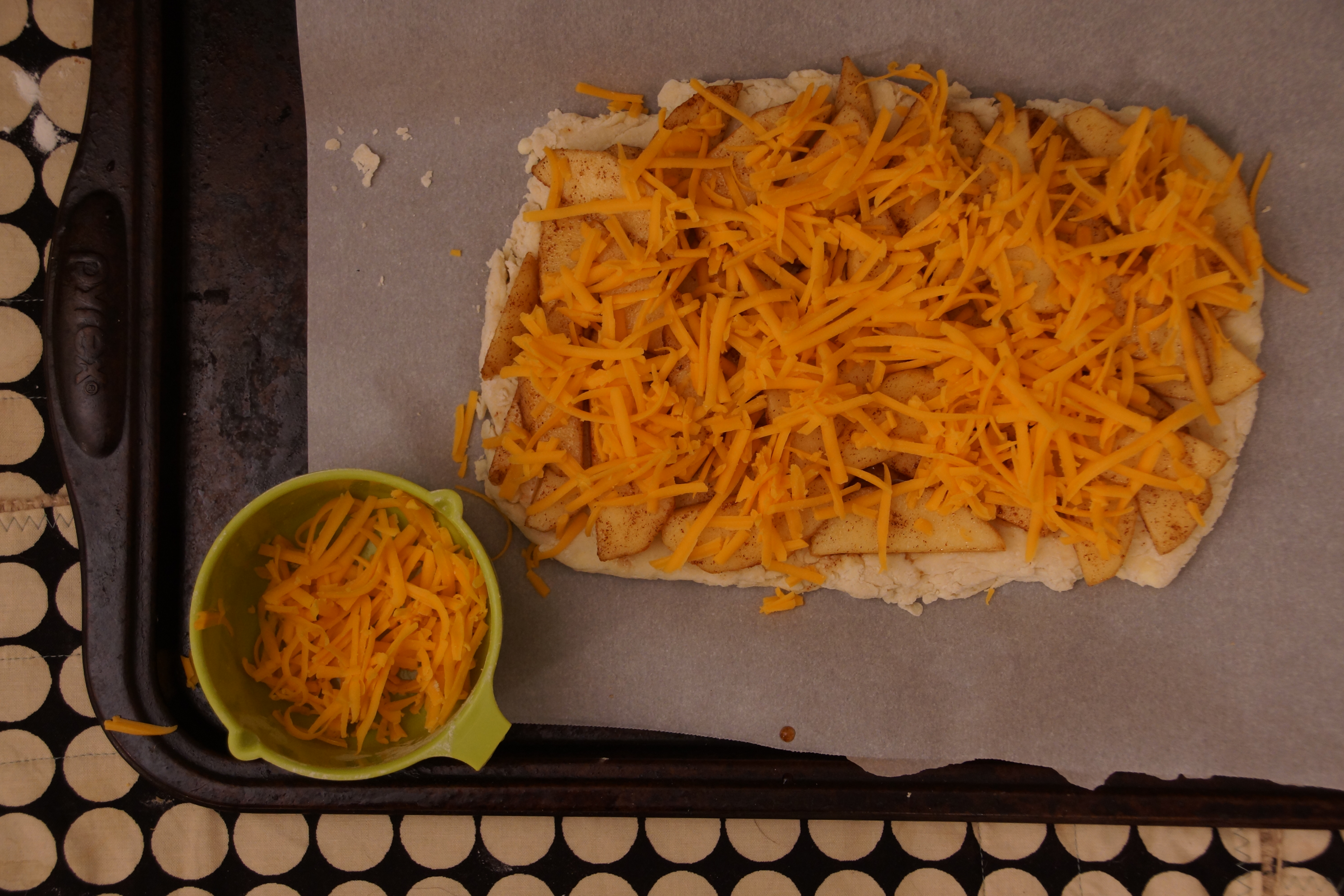 Sprinkle apples with sharp cheddar. This is no time to be stingy. Roll remaining dough into a matching, but slightly thinner, rectangle and sandwich the apples and cheddar.