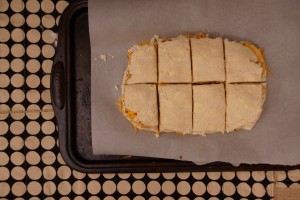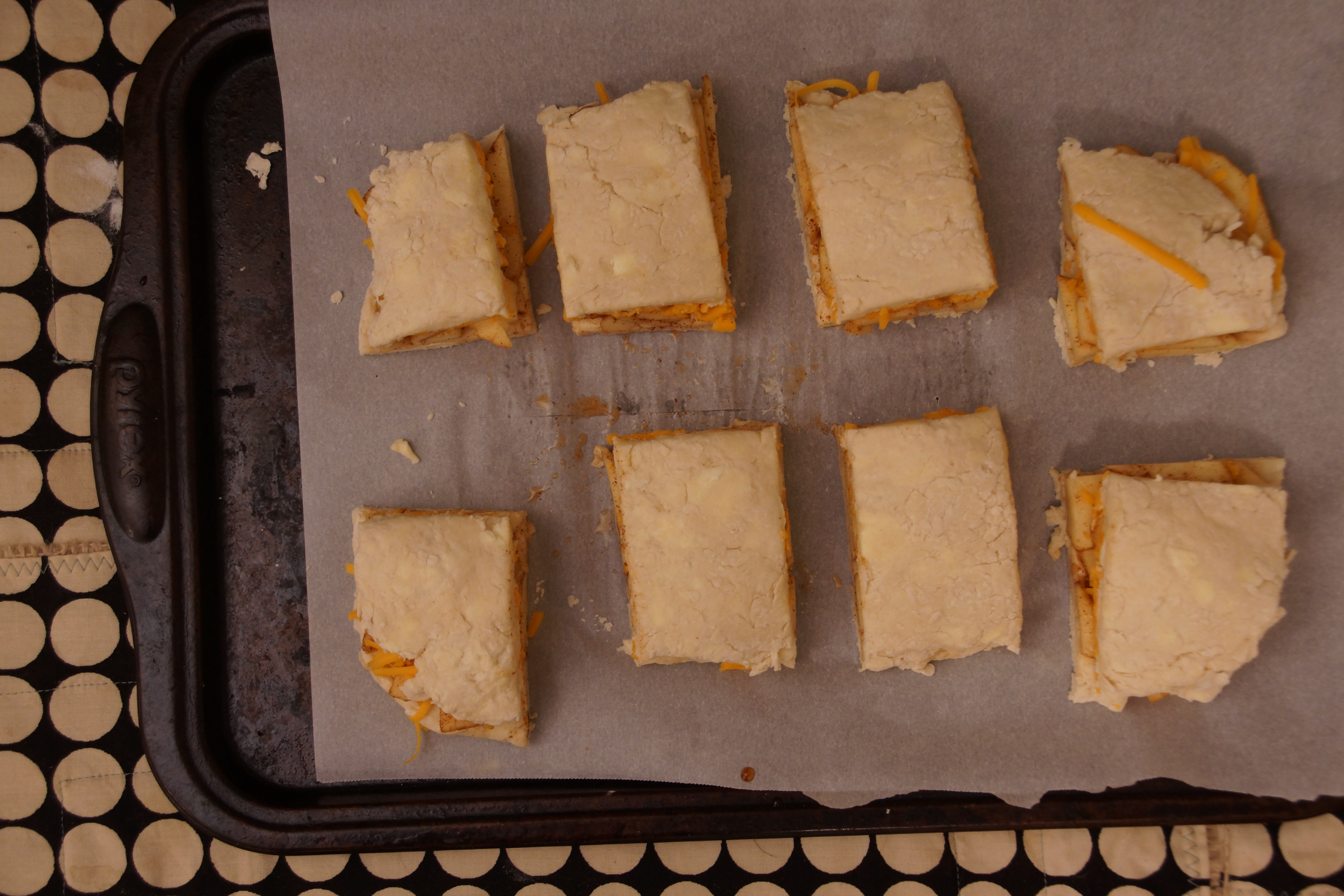 Cut into pieces and give each biscuit a little breathing room. A sprinkle of cheese over the top and they’re ready to bake.