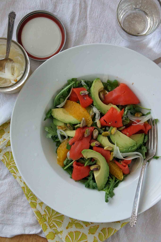 Now we’ll beautify this salad. Arrange the orange supremes, pieces of salmon, and slices of avocado on top of the greens. I went for the perfectly imperfect look, but if you feel the need to make salmon rosettes, more power to you. Finish with a smattering of pistachios and grab your fork.