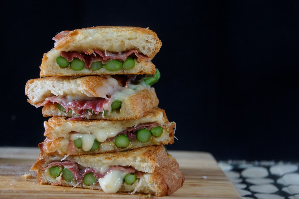 How are these for positives?  Melted cheese.  Golden, toasty bread.  Fresh asparagus.  Smoky speck.  We wouldn’t be indulging in this spectacular grilled cheese if it were 70° and sunny, now would we?  This gooey panini is the silver lining of a very gray spring, people.