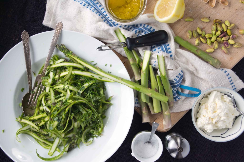1. Hold the asparagus stalks by the tough end (the part you'd usually snap off) and run a vegetable peeler along the top, down to the tip to create long, this ribbons. Place the asparagus ribbons in a small bowl with the mixed herbs.