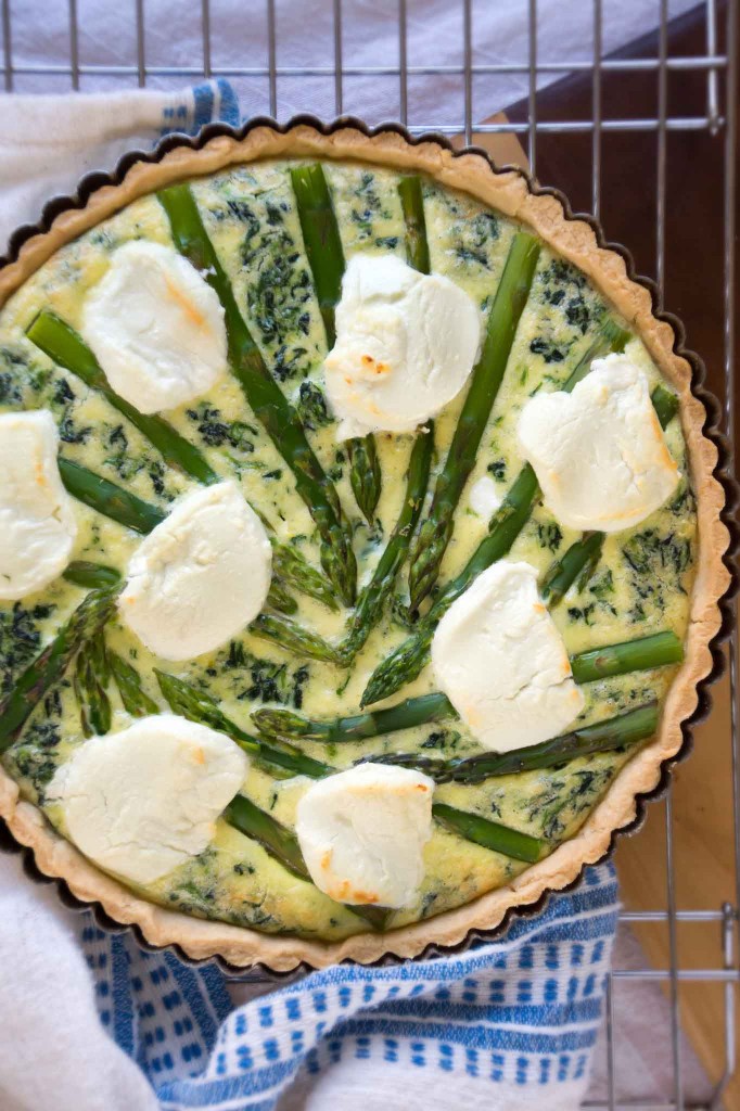 - Place the cooled crust on a baking sheet. Pour the egg and spinach mixture into the crust. Arrange the blanched asparagus on top and place the rounds of chèvre over the asparagus.