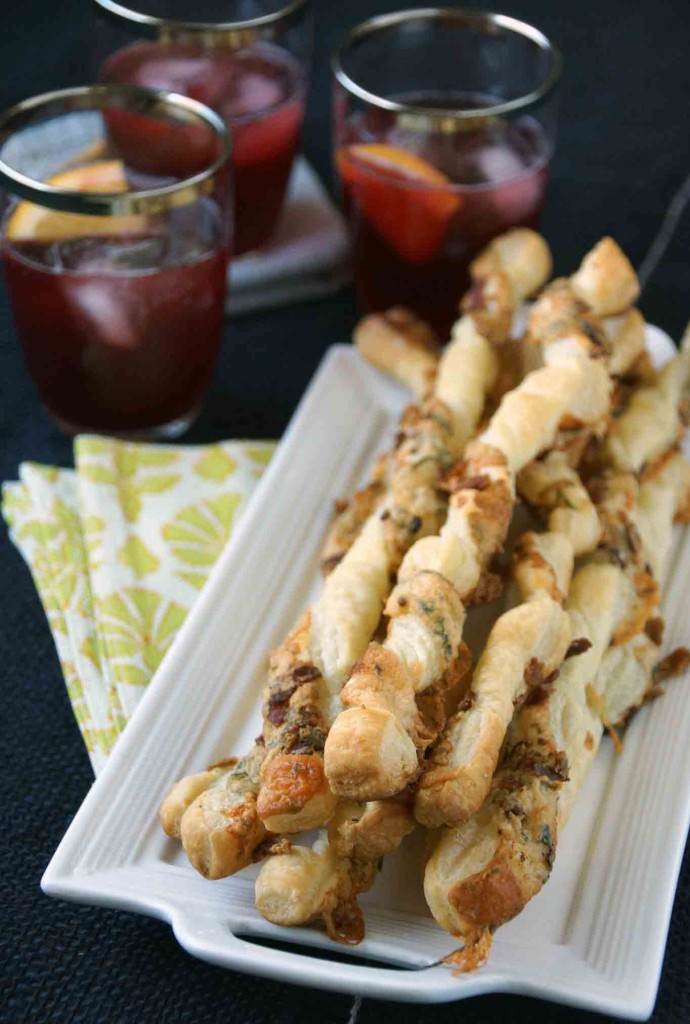 Cheese straws! They’re a win-win-win appetizer solution. Who wouldn’t love warm, flaky puff pastry crusted with cheese? And if I up the ante by adding crispy bacon, they’ll be even better! I can prep them in a couple of minutes, freeze them, then pop them in the oven to bake, just as my guests are arriving. Now if I could just figure out a way to fill everybody up on cheese straws alone…