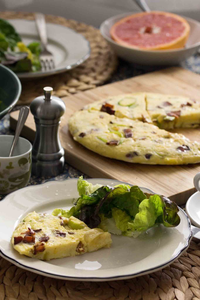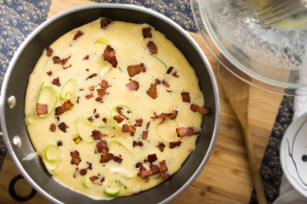 - Pour the egg mixture over the sautéed leeks. Sprinkle the bacon on top and cook, undisturbed, over medium heat until the eggs just begin to set at the edges, about 3 minutes. Transfer the pan to the oven and bake until the eggs are no longer runny on top, about 10 minutes. Keep a close eye on the frittata and do not overcook--we want to keep those eggs tender! Slide the frittata out of the pan, cut into wedges and serve immediately.