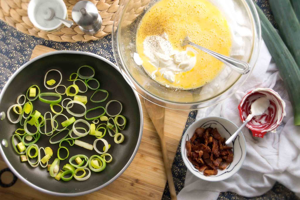 Alright, let’s get this breakfast started. All you need is a leek, a couple of strips of bacon, a few eggs, and some crème fraîche. A decent non-stick pan comes in handy, too.
