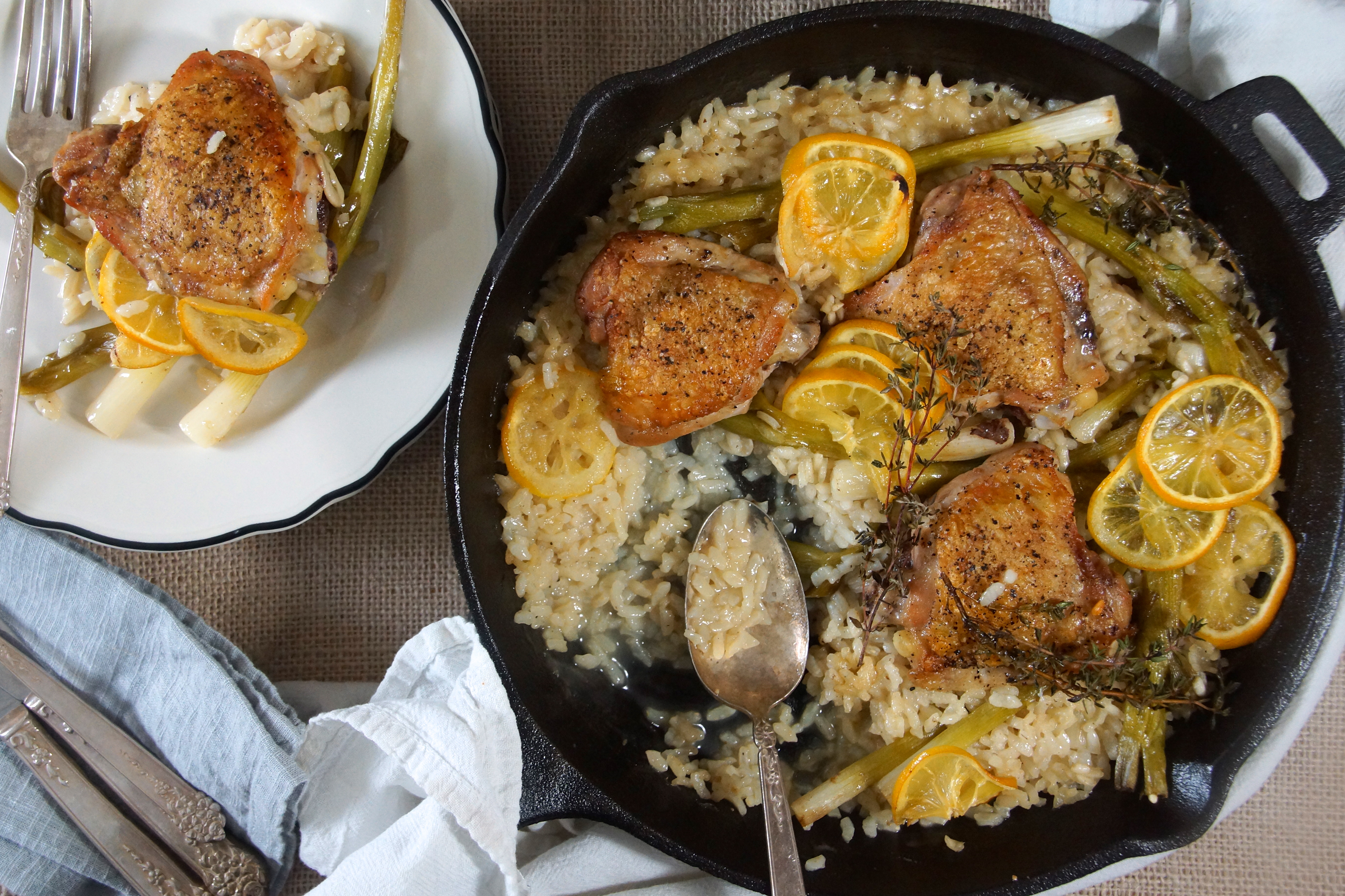 Baked Risotto with Chicken Thighs, Lemon & Scallions April 8, 2013 | posted by Sarah | 2 Comments baked risotto, recipe, chicken, lemon, thyme, strawberryplum Google+