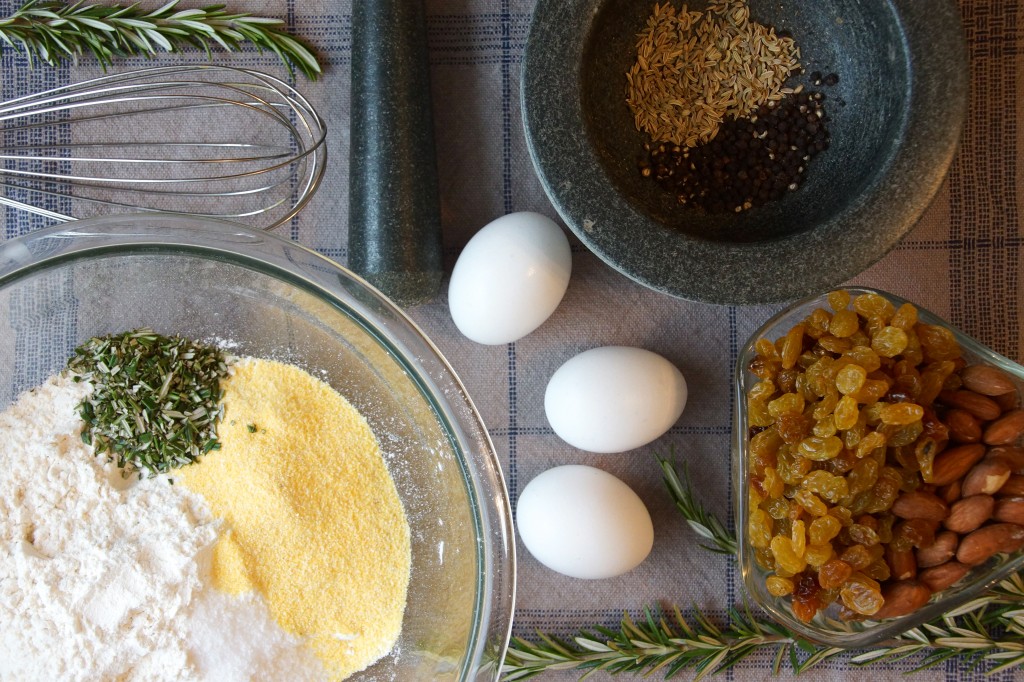 Blend eggs and sugar.  Mix in dry ingredients, along with rosemary, fennel, and pepper.  Stir in the almonds and raisins.  Divide the dough in half and pat into 2 logs.  If your dough is slightly sticky and a touch difficult to handle, you’re on the right track.  Dampen your hands and show it who’s the boss.