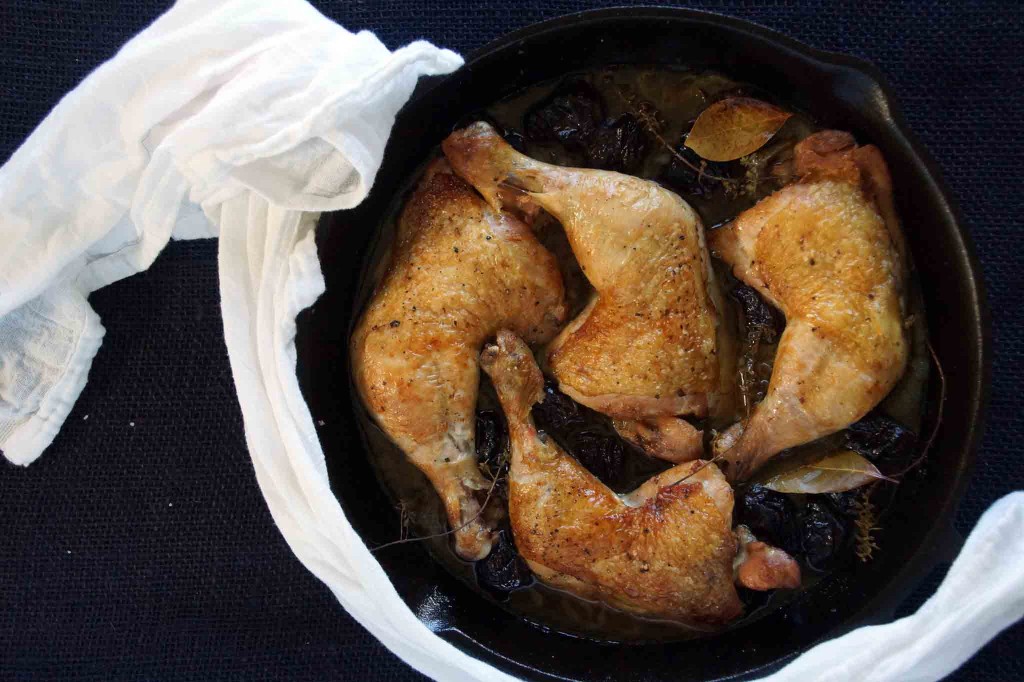 - When the chicken has finished cooking, transfer the chicken legs and prunes to a warm platter and loosely tent with foil. Remove the thyme stems and bay leaves from the pan juices and discard. Using a blender or mini food processor, puree the livers with the Dijon mustard. Add the liver and mustard mixture to the pan juices. Whisk over medium heat until smooth and thick enough to coat the back of a spoon, 8-10 minutes. Taste and adjust seasoning as needed. Spoon the sauce over the chicken and prunes and serve.