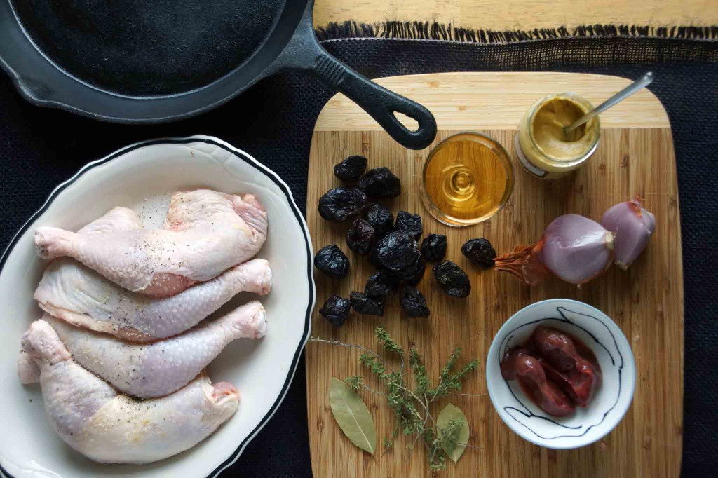 Hungry? Good, me too. Let’s get cooking. You’ll need a few chicken legs. I used whole legs but you could use just thighs or thighs and drumsticks if you want to speed up the cooking time. What else? Prunes, a giant shallot (or 2 normal-sized ones), a few sprigs of thyme or rosemary, bay leaves, Dijon mustard, and chicken livers. Oh my goodness, I almost forgot the brandy…we wouldn’t want that.