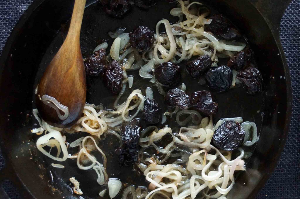 - Drain most of the fat from the pan, leaving just a thin coating. Add the shallot, season with a pinch of salt, and sauté until the slices begin to wilt. Add the prunes and the brandy. Allow the brandy to boil off, about 1 minute.