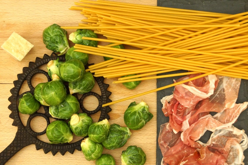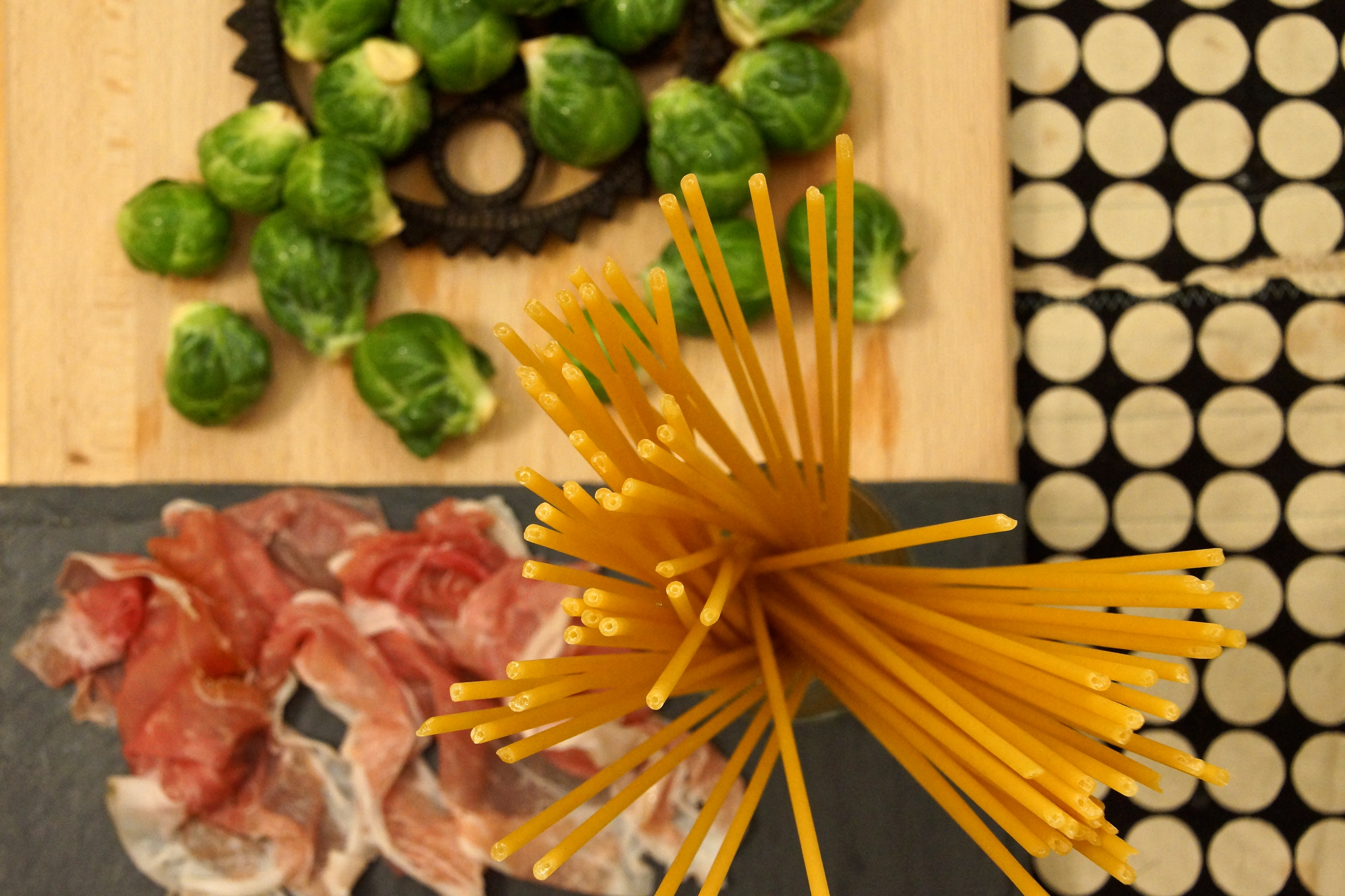 Shall we? Get the water on to boil, preheat the oven, and gather up the gang. Pasta, Prosciutto, and Parmigiano- an Italian P trifecta. Also, lots of Brussels sprouts, a couple egg yolks, and plenty of black pepper.