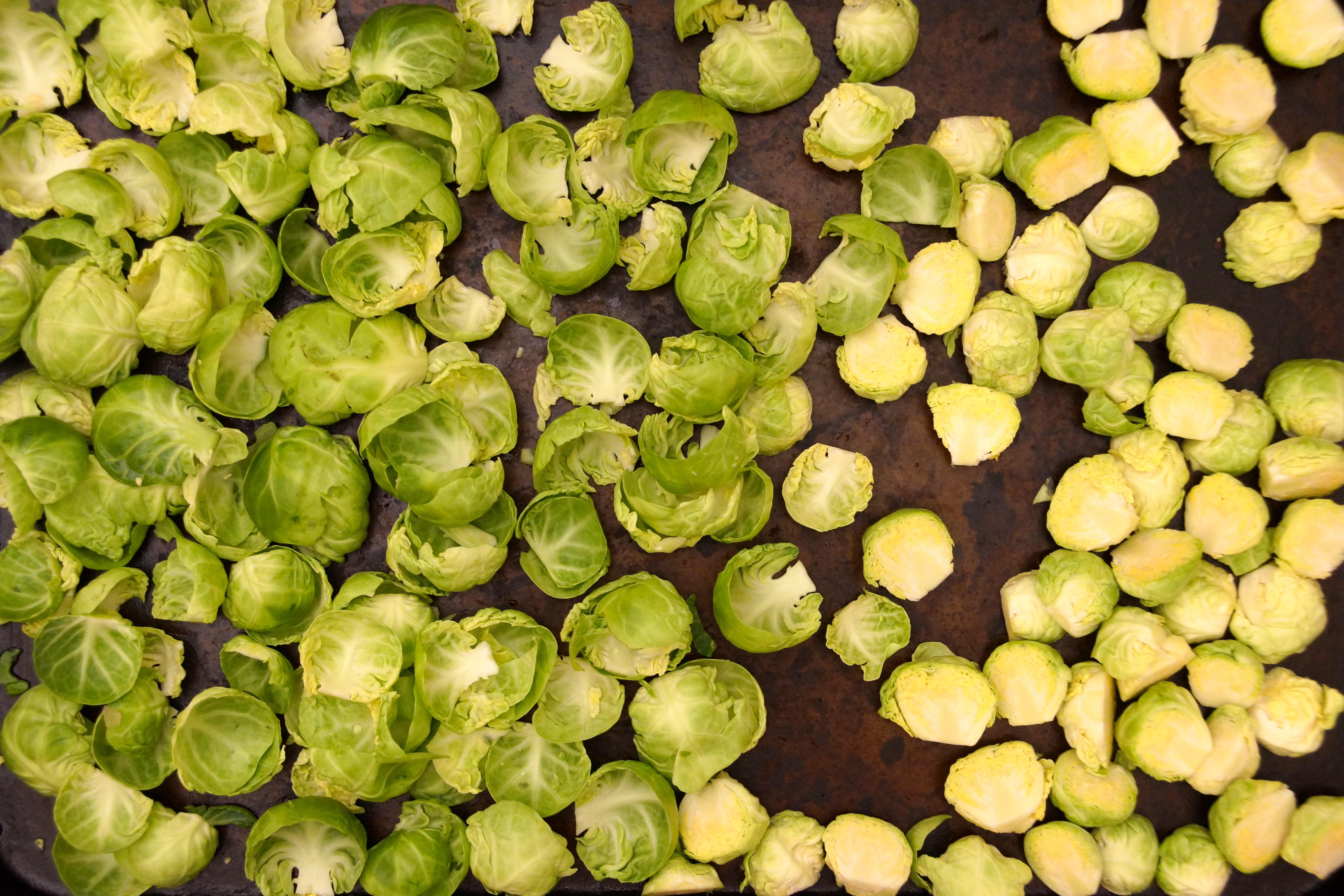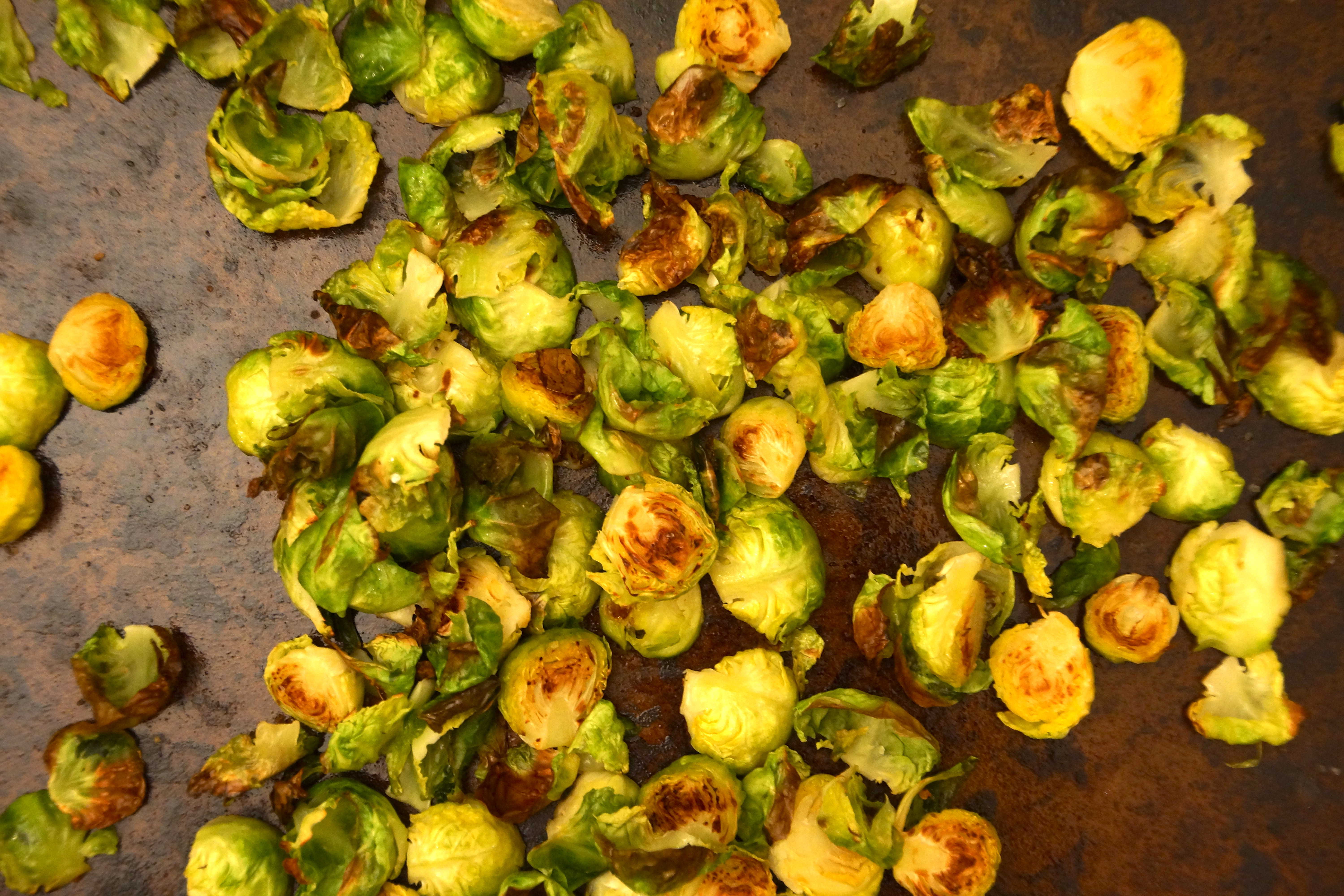 - Remove a few outer leaves of the Brussels sprouts. Cut the core of the sprouts in half. Toss halved cores with leaves, drizzle lightly with olive oil, and season with salt. Roast about 15 minutes until leaves are crisp and the Brussels sprouts have caramelized.