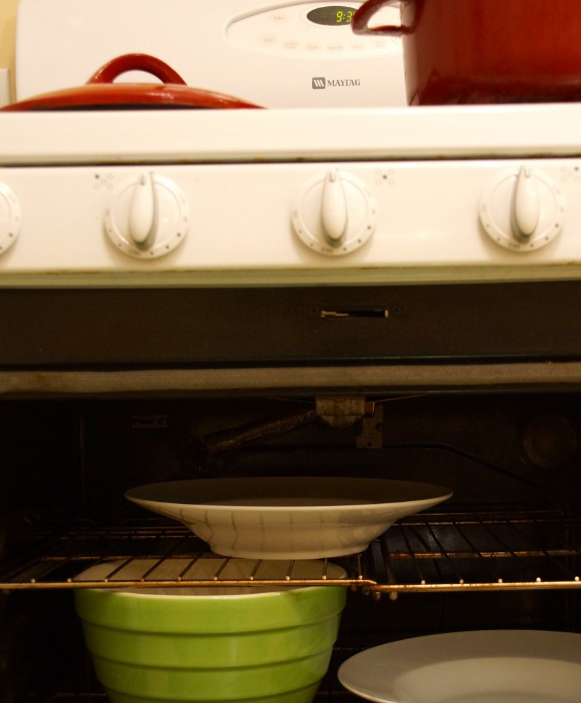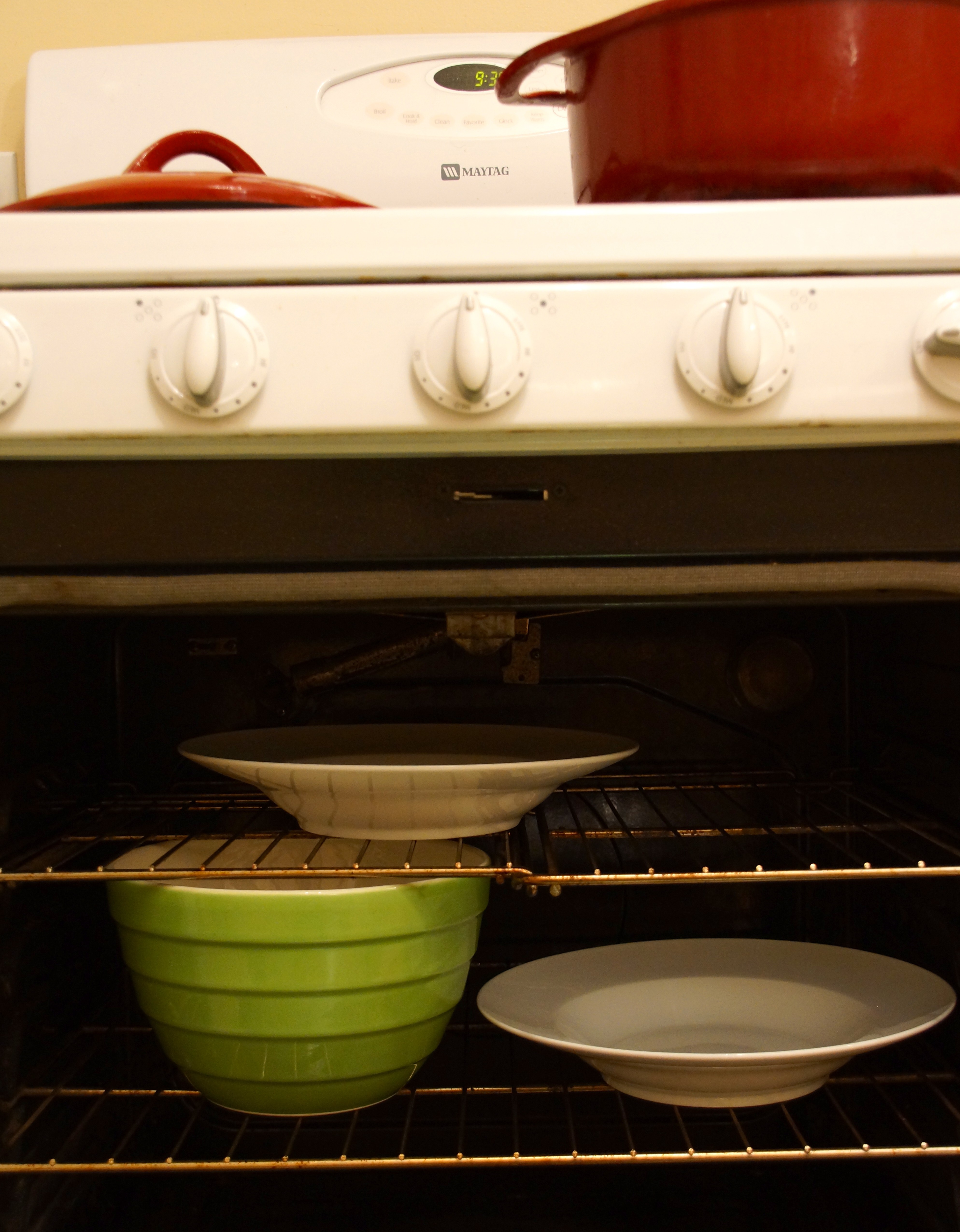 While the sprouts are off doing their thing, boil a pot of water and cook your Bucatini. Al dente. People like mushy pasta about as much as they like mushy Brussels sprouts. We’re going to sauce and finish the pasta in a big mixing bowl, so toss one in the oven so your pasta makes it to the table piping hot.
