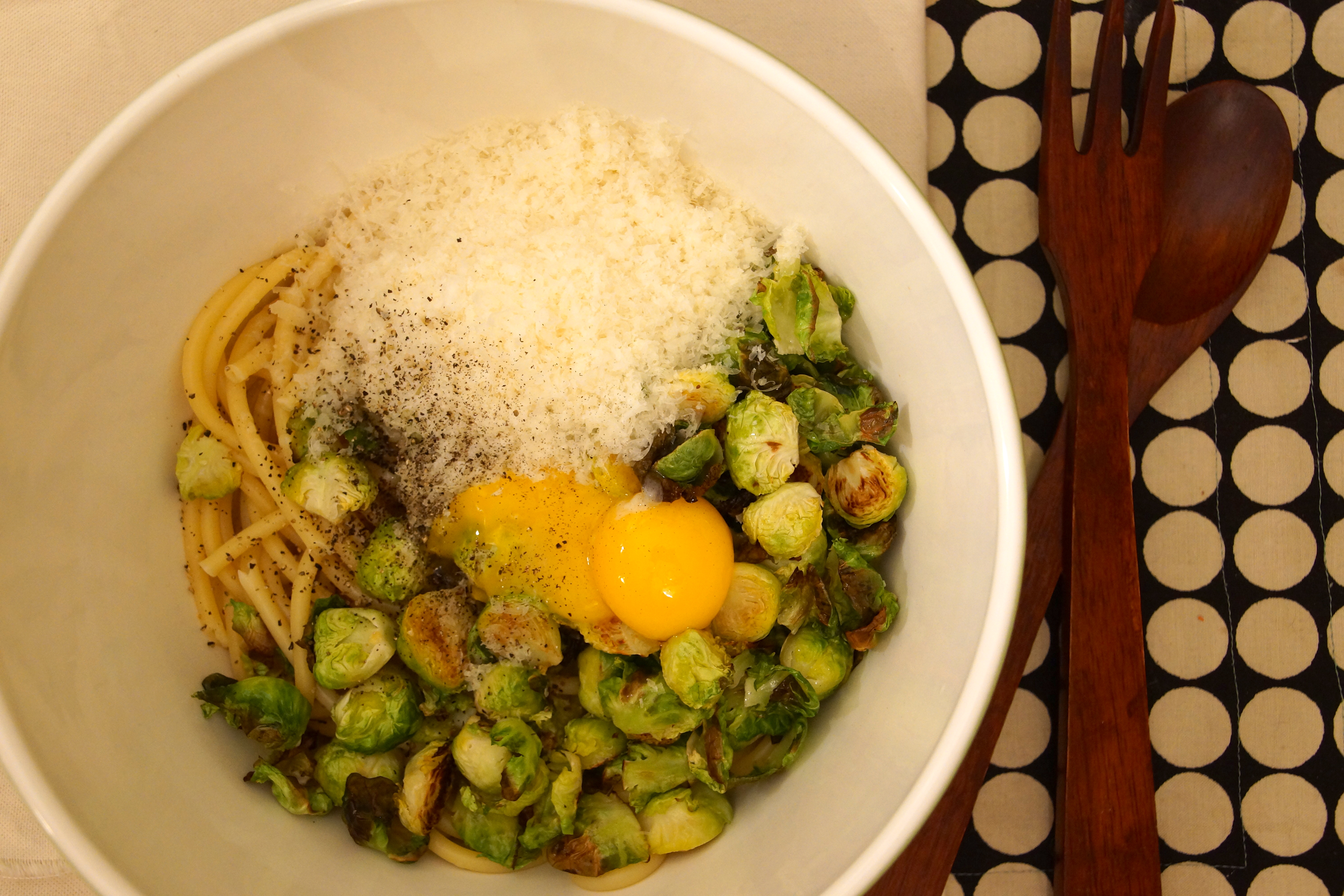 - In a large, warm bowl, combine roasted Brussels sprouts with cooked Bucatini. Toss with egg yolks, Parmesan, abundant coarsely ground black pepper, and salt(if needed).