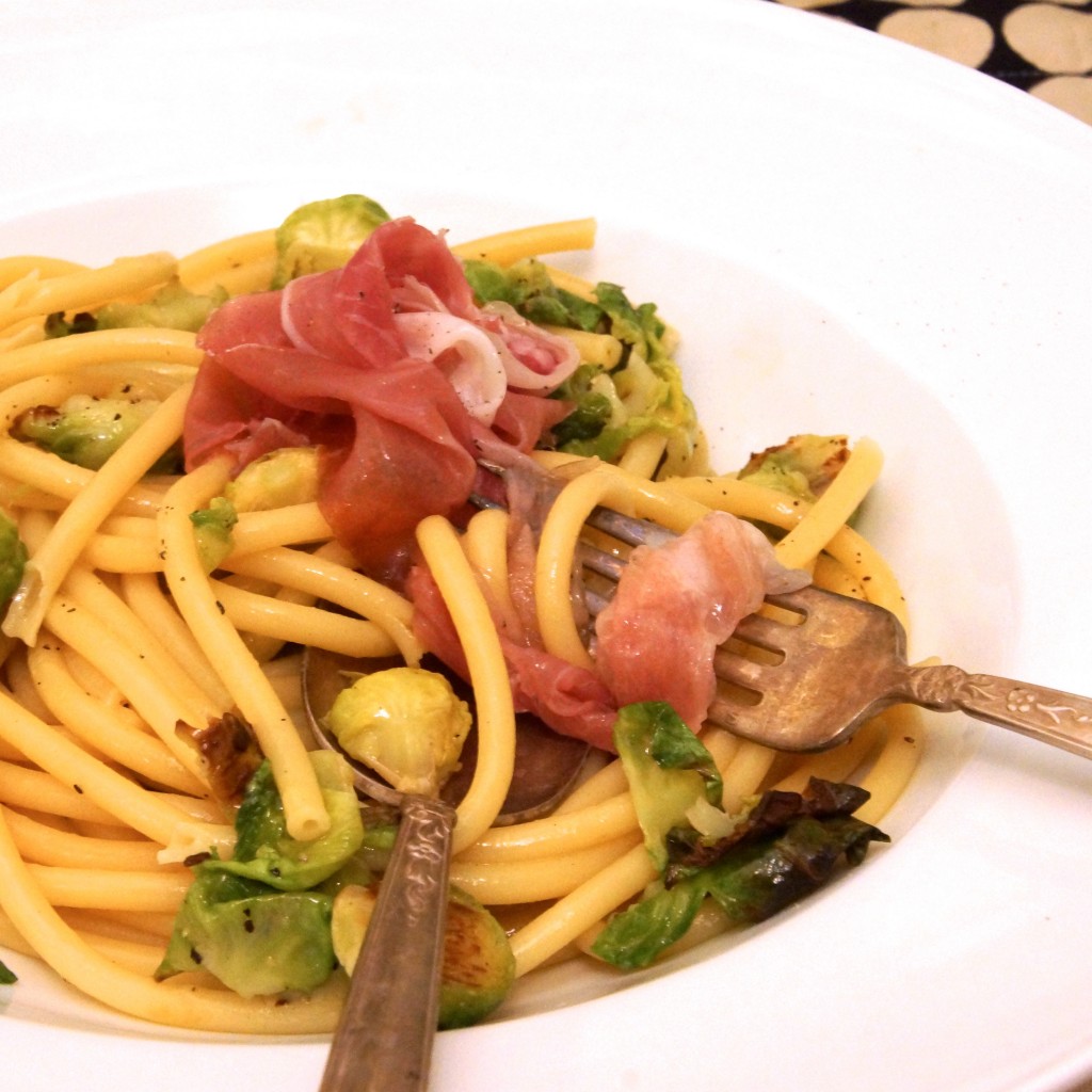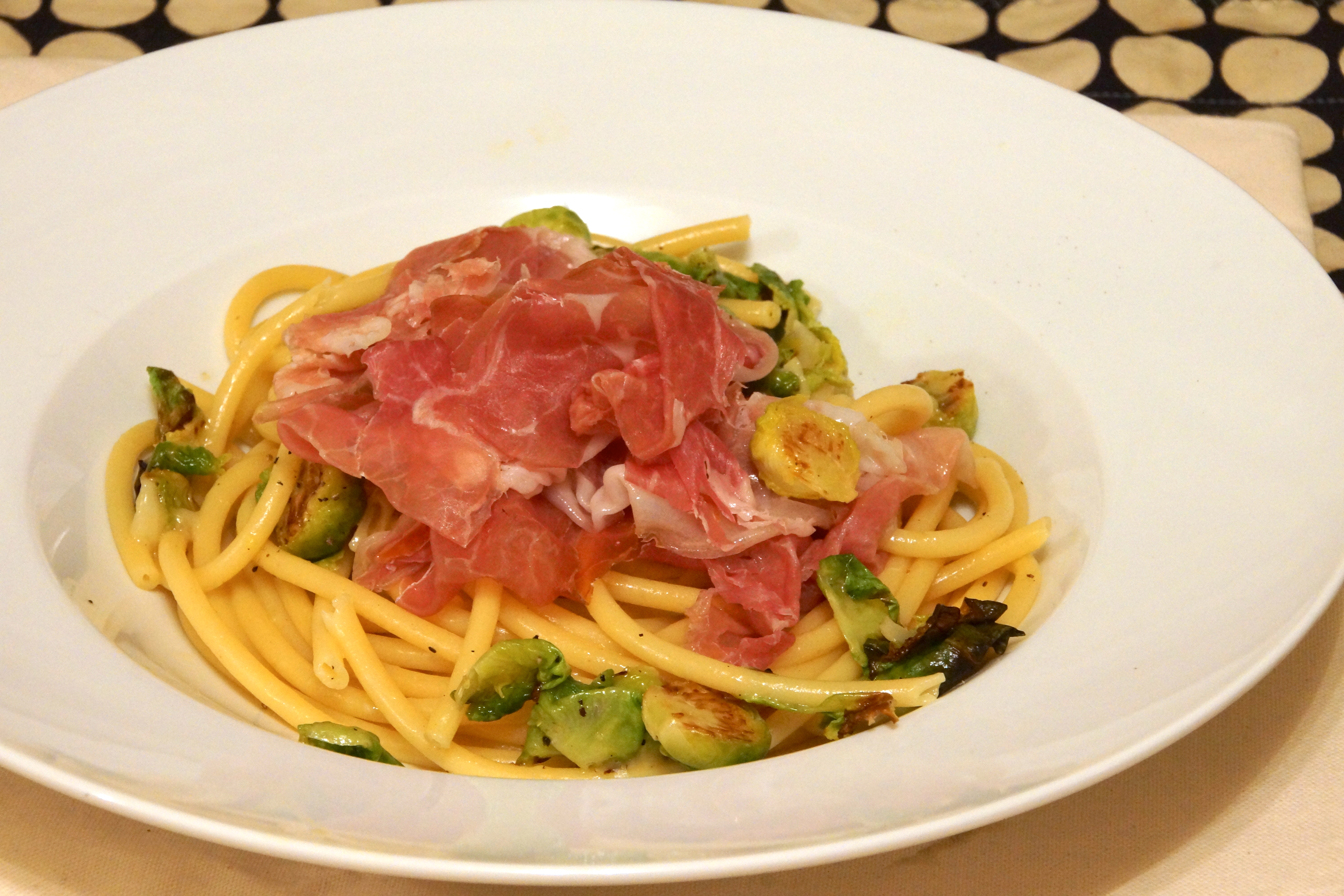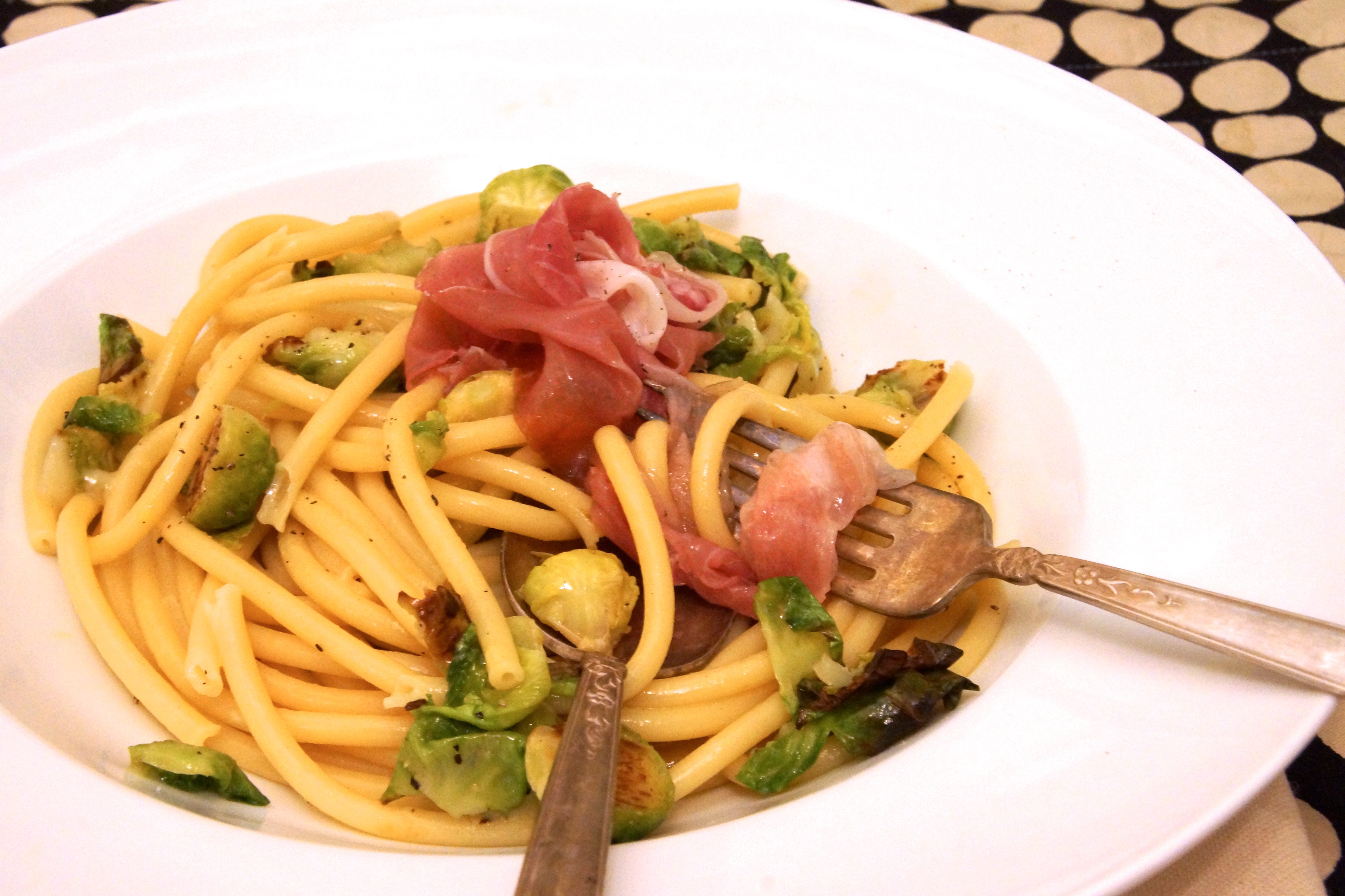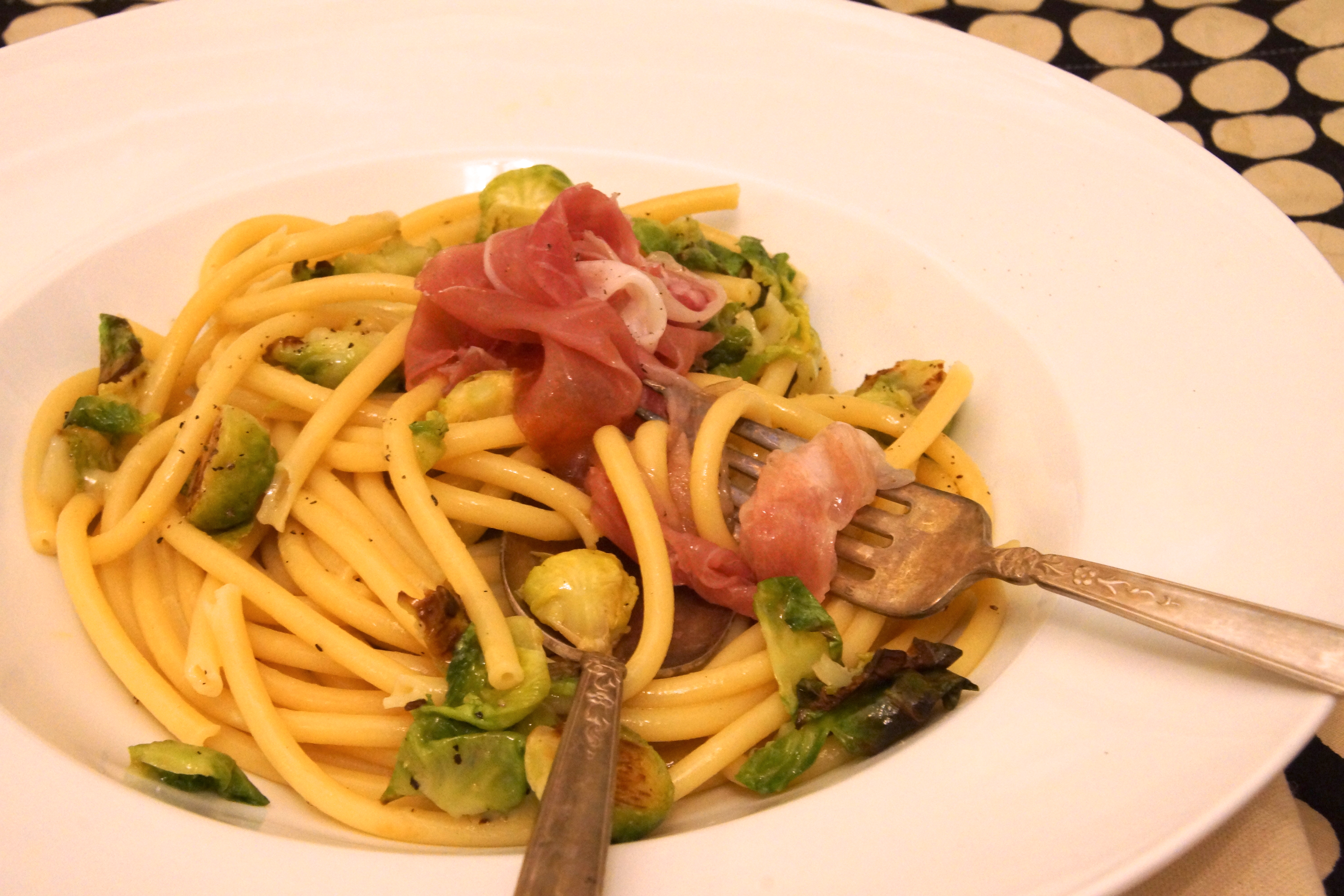 To sauce the pasta, I’m taking a page out of the alla carbonara playbook. The Bucatini gets thrown in the big, warm mixing bowl and tossed with our roasted Brussels sprouts, a couple egg yolks, and copious amounts of grated Parmesan. Add fresh black pepper until your grinding wrist is sore, artfully arrange some Prosciutto over the top, and dig in.