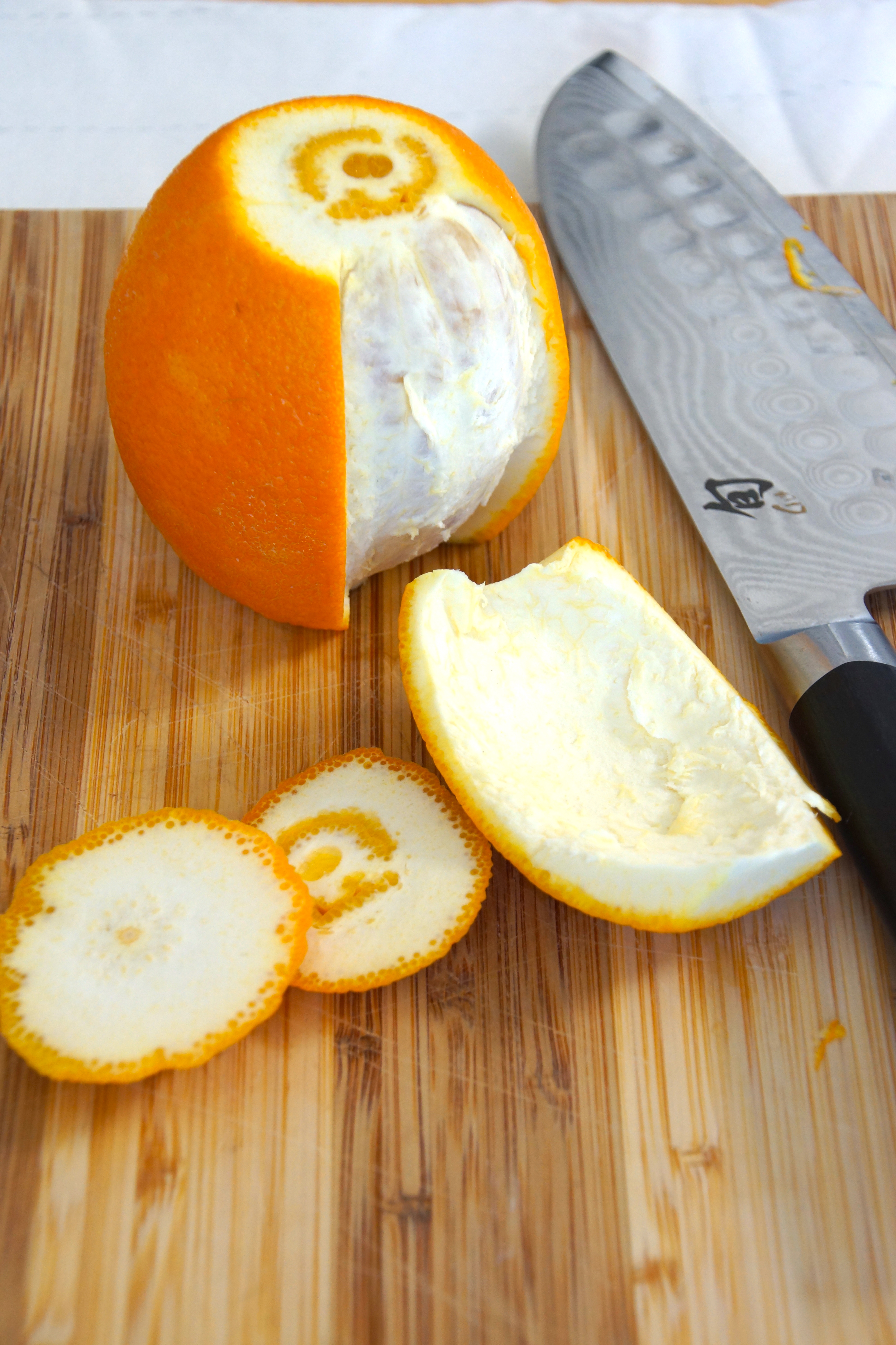 2. Meanwhile, cut tops and bottoms off each orange. Score the skin of each orange in quarters. Remove peel, keeping pith intact. Slice peels lengthwise into ¼ inch strips.