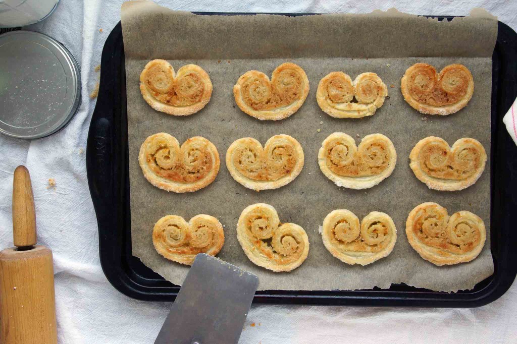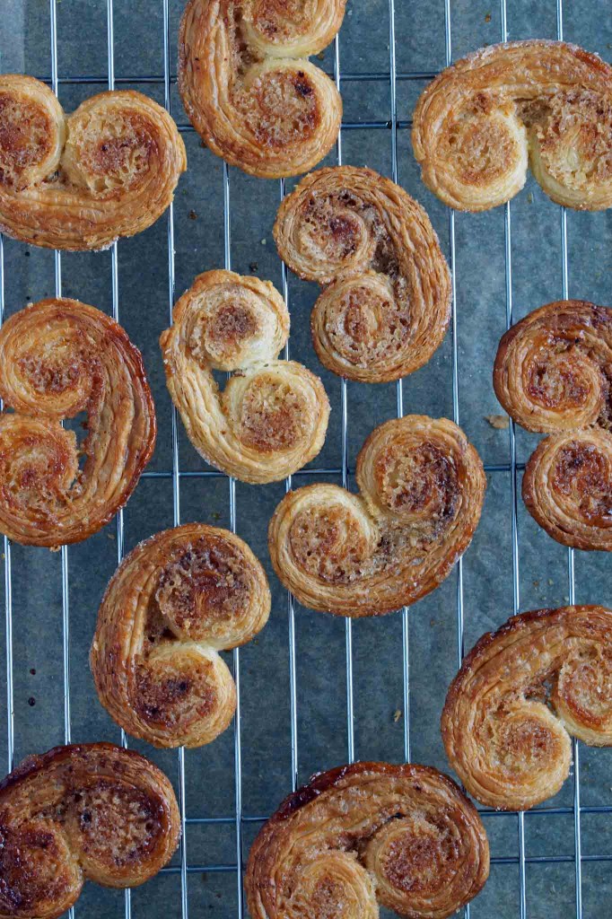 - Cut the rolled puff pastry crosswise in ¼-½ in. intervals. Place the cookies on the lined baking sheet and bake for 7-8 minutes. Remove the pan and flip the cookies. Return the pan to the oven for another 7-8 minutes until the pastry is golden. Total baking time will be about 15 minutes and you’ll want to keep a close eye, as the puff pastry can burn easily. Transfer to a wire rack to cool. The palmiers will keep pretty well for a day or 2, in an airtight container at room temperature.