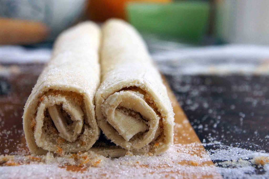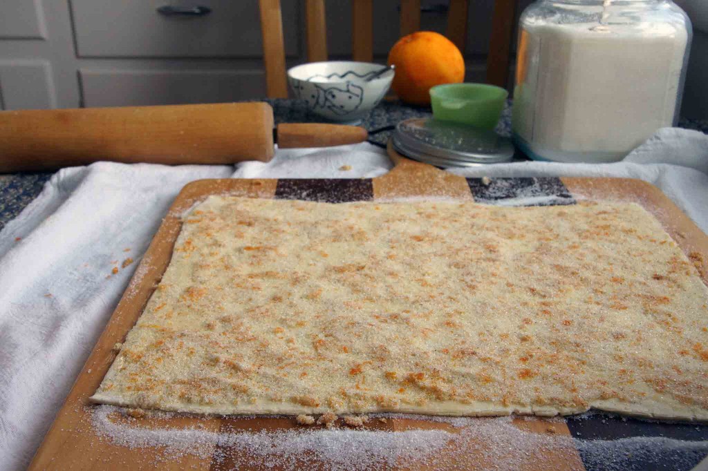 - Sprinkle 2 Tbsp. sugar over a large board or clean counter. Unfold the puff pastry and place over the sugar. Roll into a 10 in. x12 in. rectangle. Brush the dough with the melted butter. Sprinkle the sugar and spice mixture evenly over the top of the dough. Use your palms or a rolling-pin to press the sugar into the pastry dough. With the short side of the dough facing you, tightly roll the dough over itself until you reach the center. Now do the same from the other side until you have 2 tight rolls, side by side. Cover and chill for at least 30 minutes before proceeding.