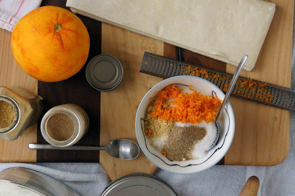 You’ve got to love the fact that these take about 3 minutes to prep, look beautiful, and taste great. You’ll just need a sheet of puff pastry that’s been defrosted, a bit of melted butter, sugar, orange zest, cardamom, and ginger.