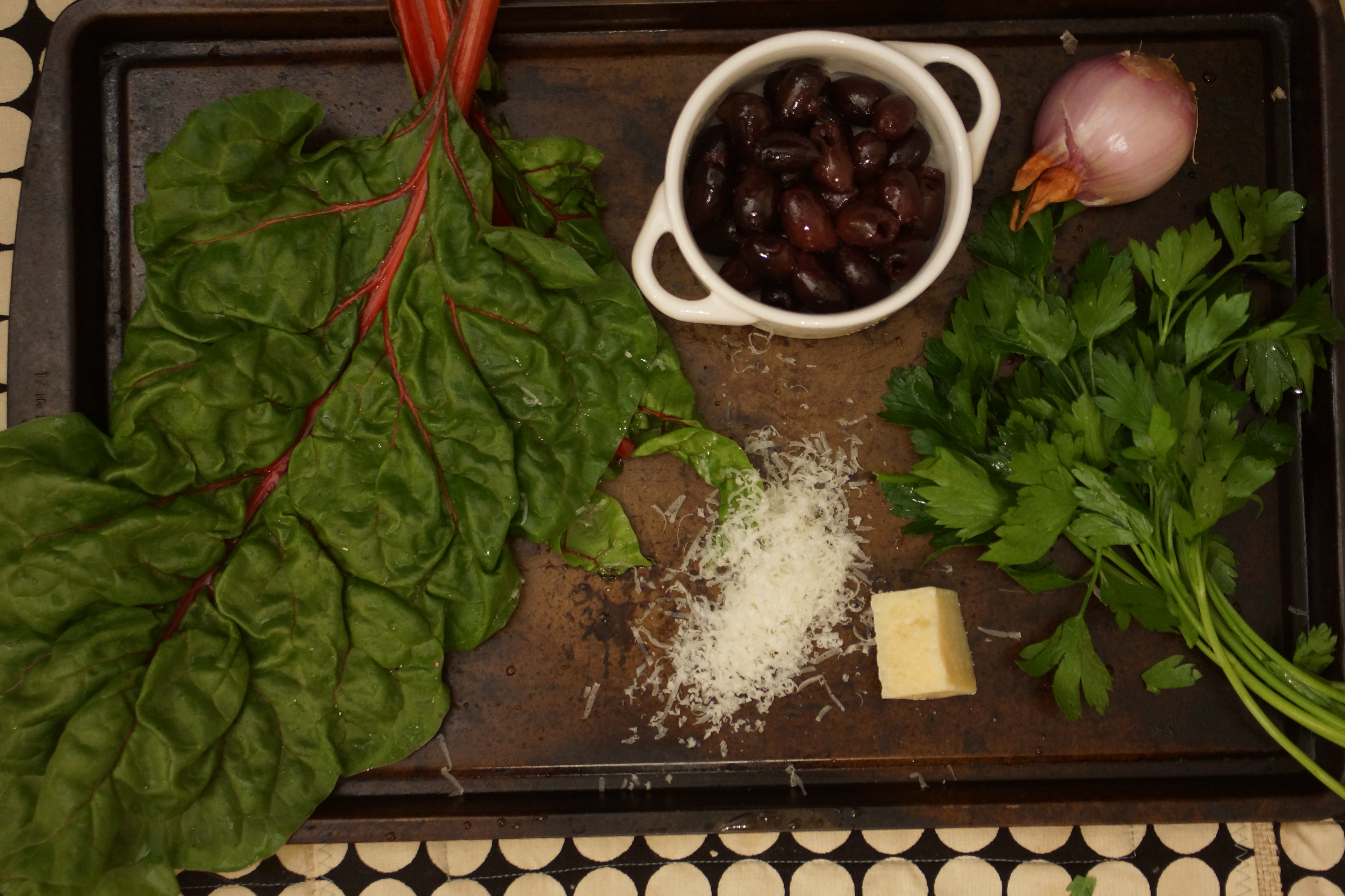 Just a few star ingredients: ruffled leaves of chard, shiny Kalamata olives, parsley, grated Parmesan, shallot. We’ll need ground chicken, breadcrumbs, couple eggs, lemon, and chicken stock, as well.