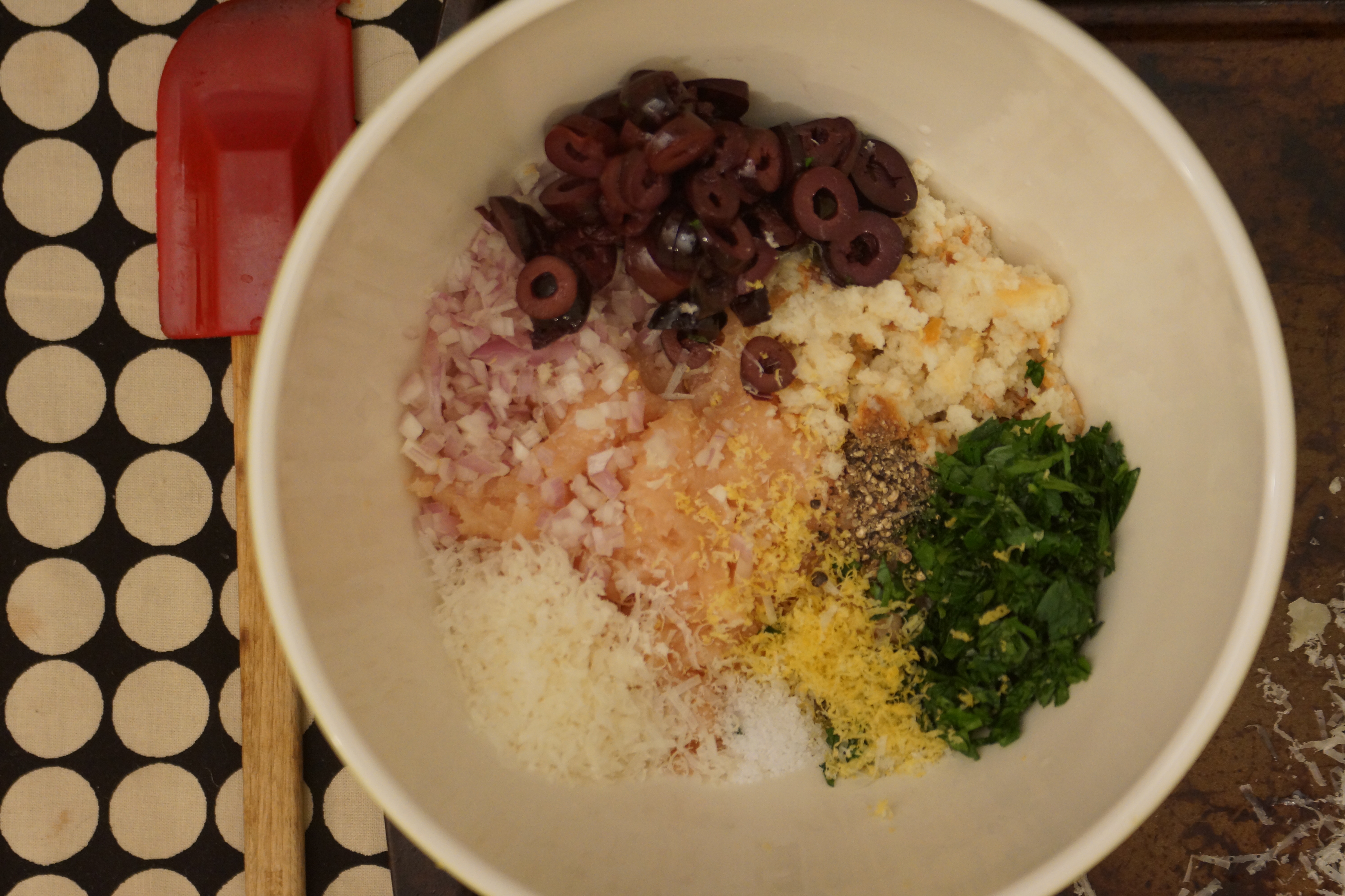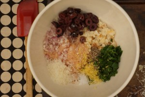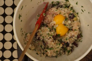 While the consomme clarifies, mix the ground chicken with all the goodies- olives, grated Parmesan, parsley, lemon, and shallots. Toss in some breadcrumbs and egg yolks and you’re ready to roll.