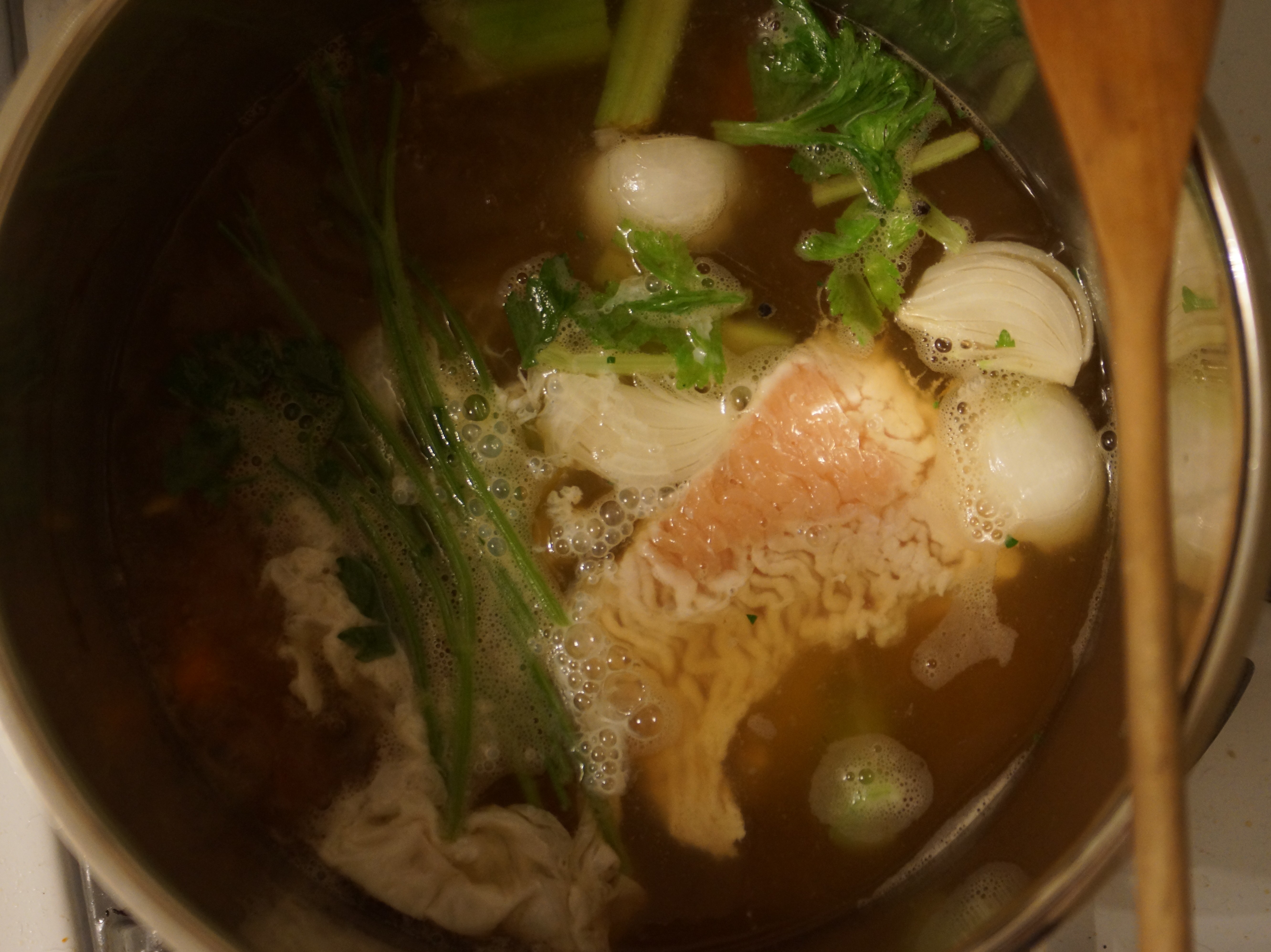 - In a large pot, bring chicken stock to boil along with roughly chopped carrot, celery, onion, handful of parsley, bay leaf, whole peppercorns, and red pepper flakes. Add a quarter of the ground chicken and the egg whites and simmer 45 minutes to one hour, until the consommé is flavorful and clear.