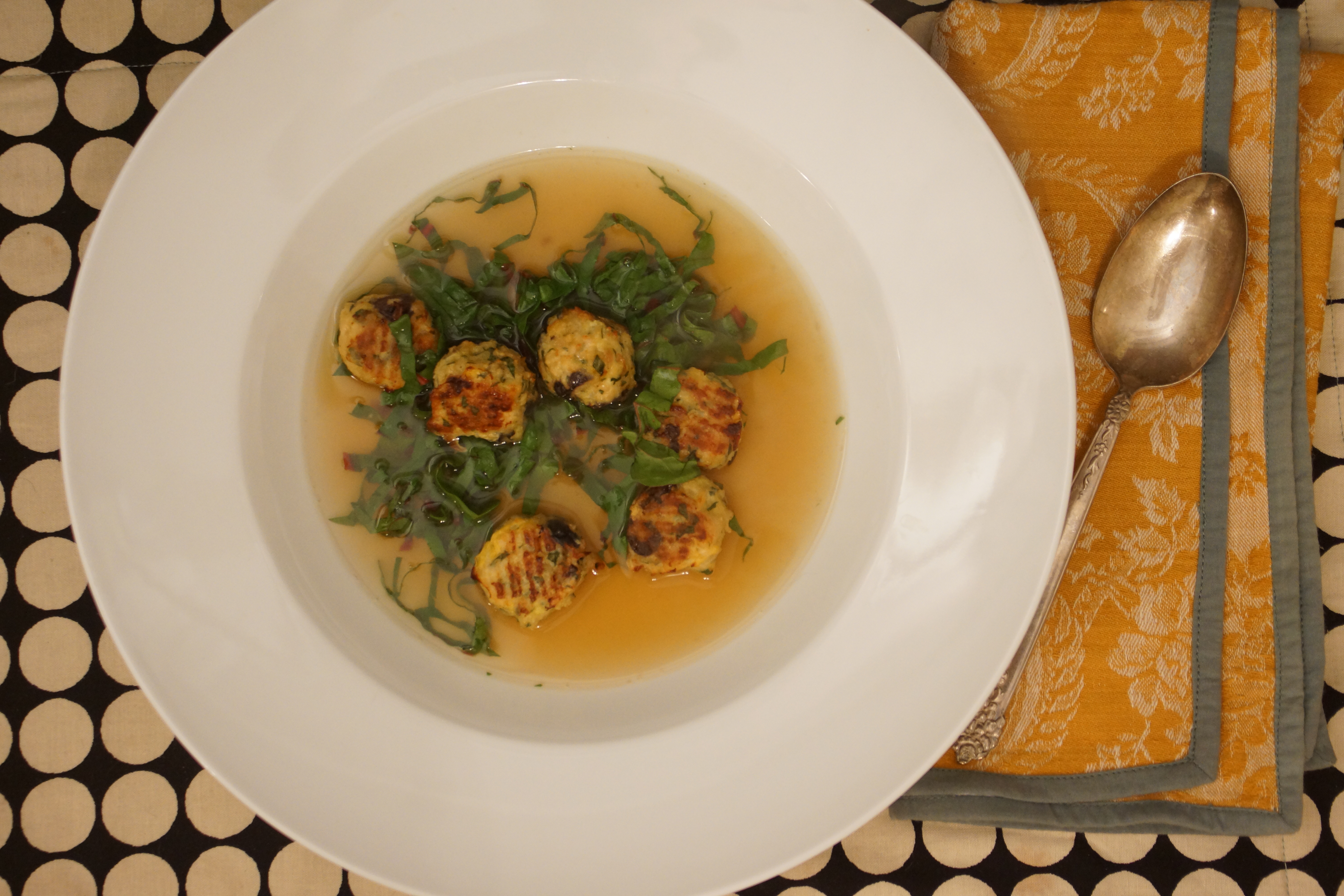 Here’s a recipe that proves I’m not a total glutton and that simple, healthy foods can be blog-worthy. It is a chicken consommé with baked chicken-olive meatballs and strands of Swiss chard. Perfect; I’m calling it consommé so it sounds all French and elegant, it’ll be healthy because there’s a bunch of barely wilted chard in it, satisfying enough for dinner because there will be half a dozen meatballs bobbing around in each bowl.