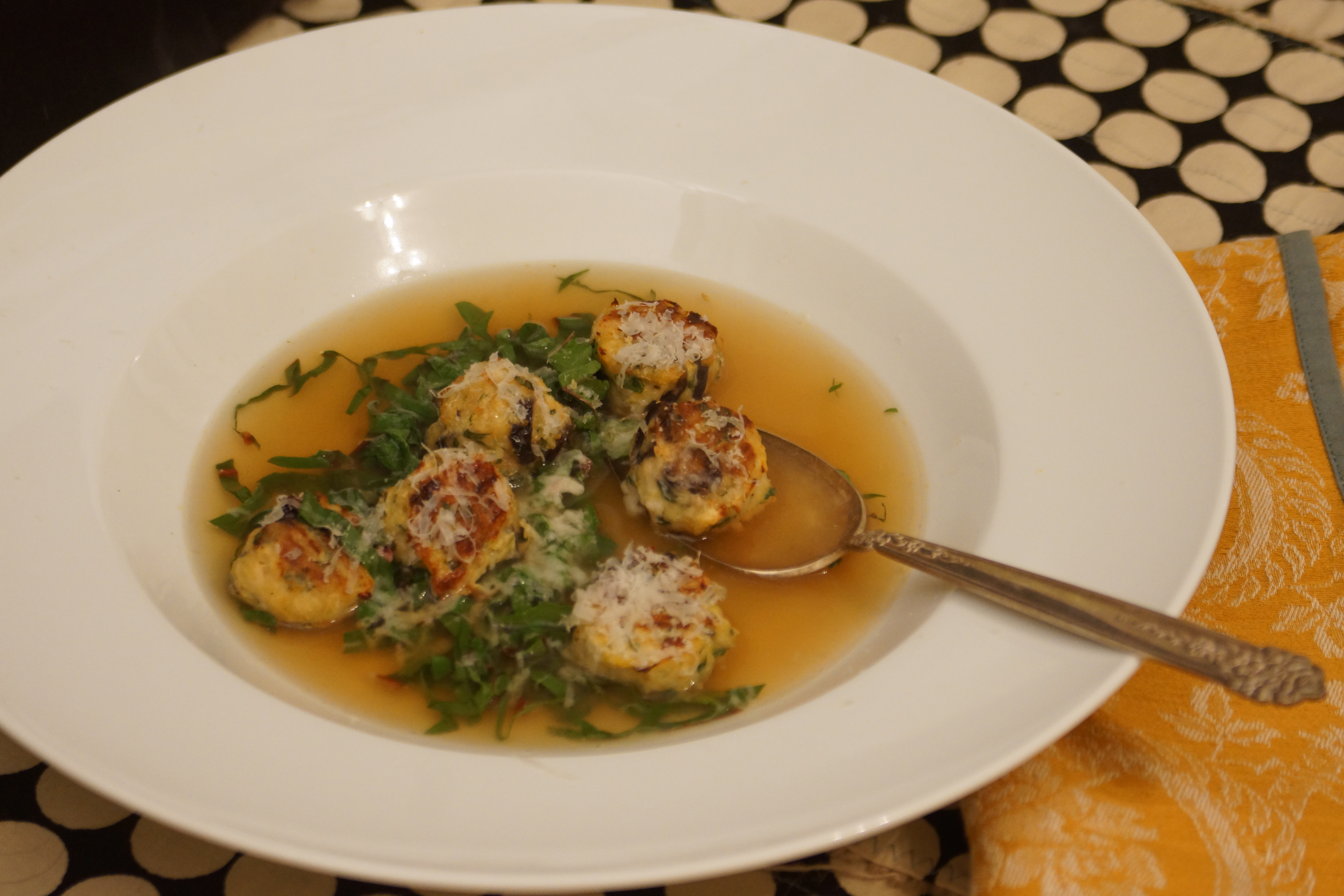 - Divide meatballs between warm soup bowls, place a handful of sliced chard in the center of each bowl, and ladle consommé over the top. Garnish with additional grated parmesan, if desired.