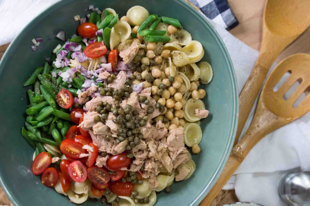 - Add the sliced green beans, tomatoes, chickpeas, tuna, onion, and capers to the pasta. Toss with the remaining vinaigrette. Season with plenty of black pepper. The salad holds up well for a day or 2 and can be freshened up with a squeeze of lemon or a splash of vinegar before serving.