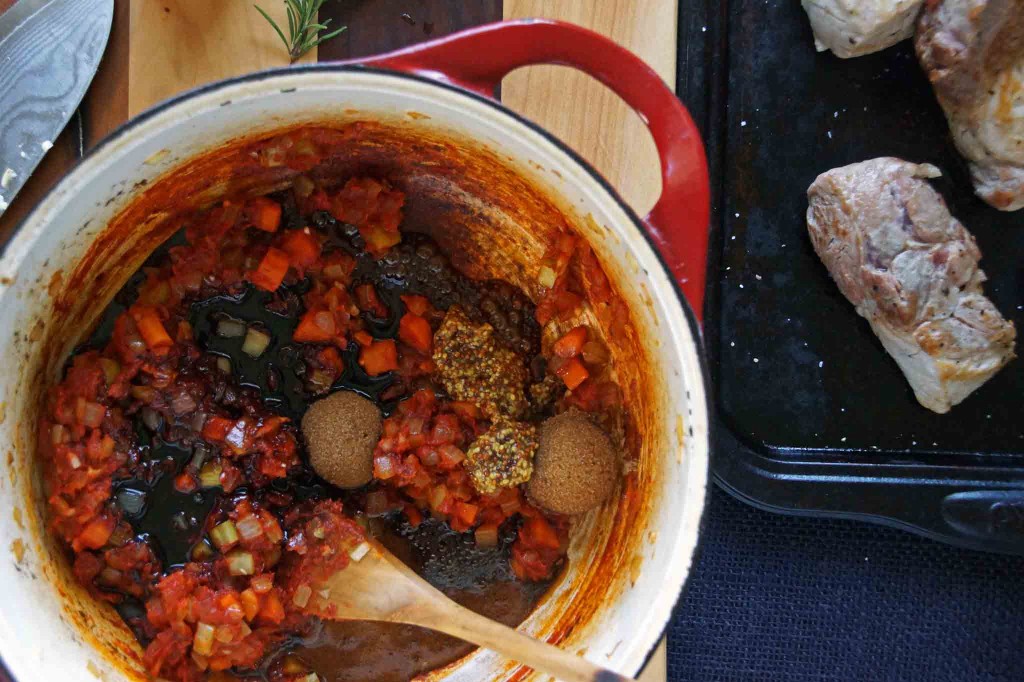 2. Now we’ll start building the braising liquid. Add a little more oil to the Dutch oven (unless enough remains from searing the meat-you just want a thin coating). Add the diced onion, carrot, and celery along with a pinch of salt. Sauté over medium-high heat until the onion starts to color and the carrot and celery soften slightly, about 8 minutes. Use a wooden spoon to scrape up any brown bits of meat that might be stuck to the bottom of the pan as you go. Add the garlic and sauté for another minute. Clear a spot in the pan and add the tomato paste. Cook the tomato paste for a minute or 2, then stir it into the vegetables. Add the mustard, sugar, molasses, vinegar, and a good pinch of salt. Stir. Add the cider, stock, rosemary, and bay leaves. Return the pork to the pan and bring to a slow, steady simmer. Simmer, partially covered until the pork is fairly tender, about 2 hours.