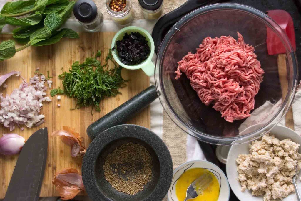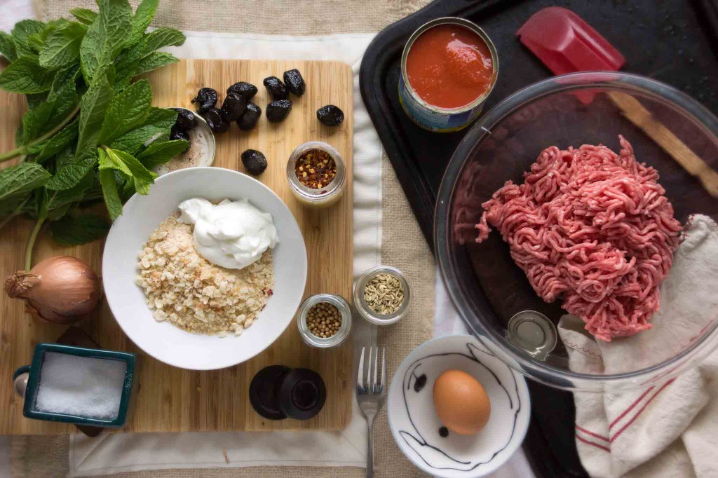 Okay, let’s make some meatballs!  You’ll need ground lamb,a can of tomatoes, an egg, breadcrumbs and yogurt, a shallot, black olives, a bouquet of fresh mint, red pepper, coriander seeds, and fennel.