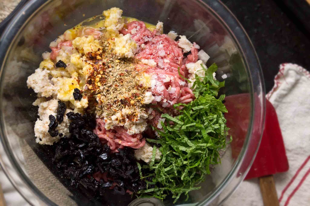 Lamb Meatball IngredientsCombine the breadcrumbs with the yogurt and let the mixture sit and soften into a thick paste that we’ll use to bind our meatballs.  Meanwhile, toast the spices until you start to smell them.  Mince a shallot, chop the olives, chiffonade some mint, and whisk the egg.