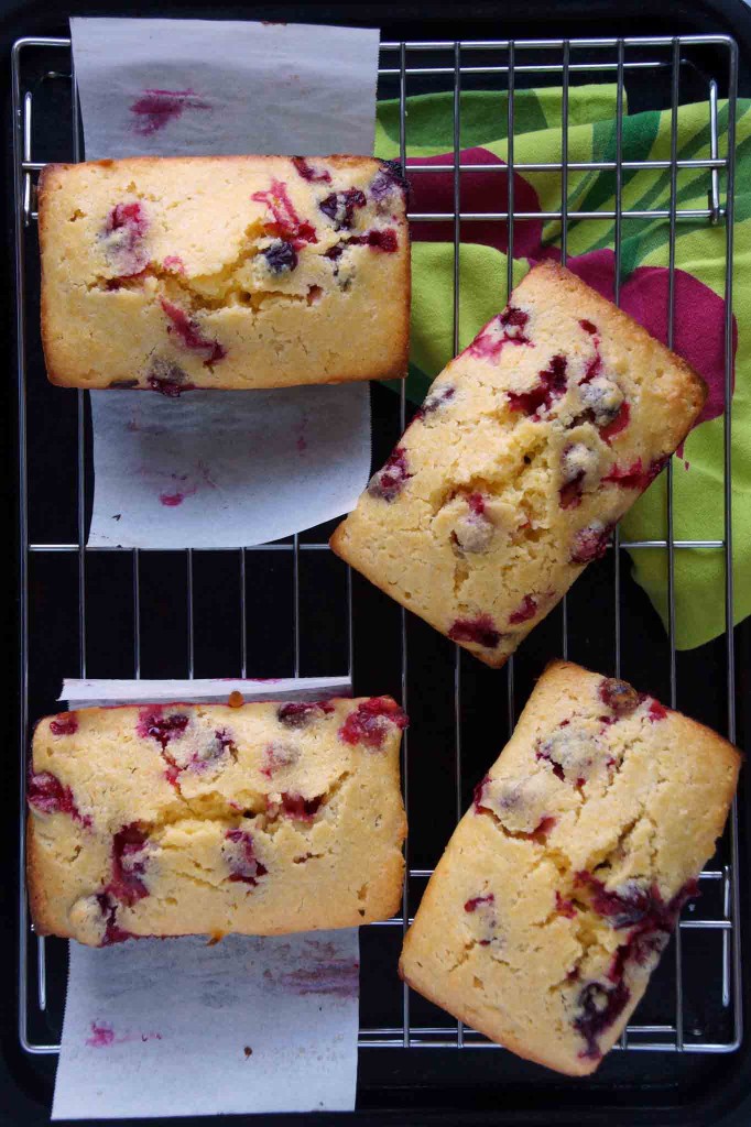 This is a great quick bread–tender and cakey, made with cornmeal and buttermilk, bursting with winter citrus and bejeweled with tart cranberries. It’s perfect to give as a gift, but if you want to bake a loaf just for yourself and enjoy in a dark, quiet room away from the hustle n’ bustle, that’s cool, too.