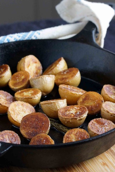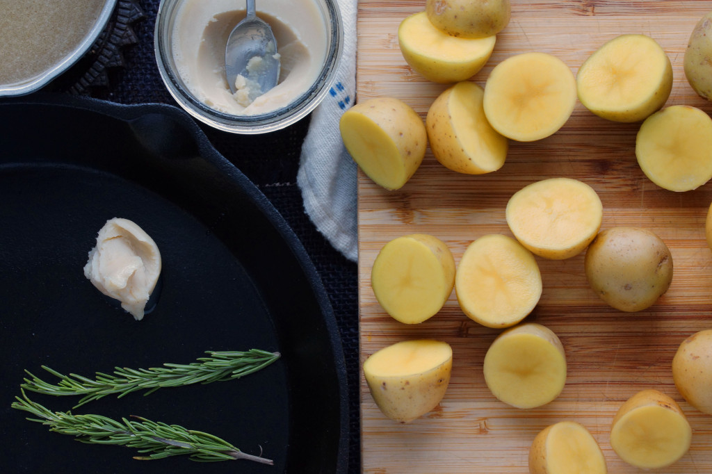 Scrub the potatoes and cut them in half. I leave the skin on, you know, for my health. Wait, we’re cooking potatoes in duck fat, why would I mention health? I leave the skin on because I actually prefer it, plus I’m lazy. Melt the duck fat (or butter) in an ovenproof skillet on the stovetop. I like to add a few sprigs of rosemary or a couple of cloves of smashed garlic to infuse the fat with more flavor.