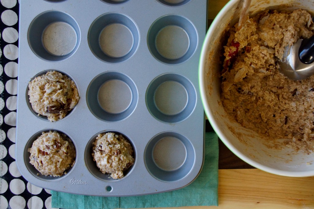 Put a small pan of quinoa on the stove while you prep everything else. Turn the oven on, grease or line your muffin tin, melt butter, measure out dry ingredients. Compile your arsenal of add-ins: dates, coconut flakes, and pecans.