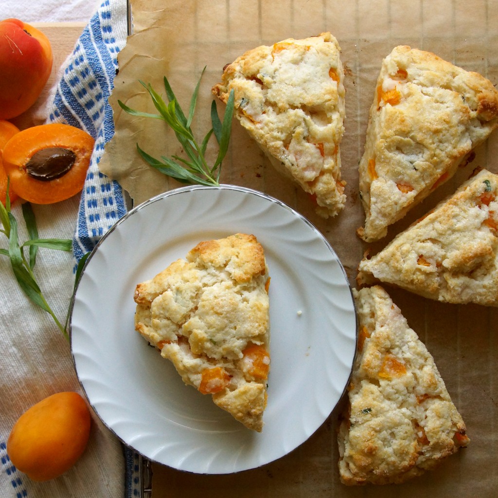 This spring, as soon as fresh apricots made an appearance at the grocery store, I made a salad with them and the first sprigs of tarragon from my garden.  The combination was good, day-dreamy good, and my mind wandered to familiar territory: butter, baking, and scones.
