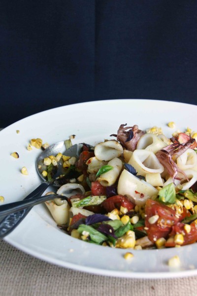 So let’s do this. Let’s make another tasty salad jammed with summer flavors: ripe tomatoes from the garden, sweet corn, and basil. It’s still too warm to cook indoors, so , obviously, we’ll have to put the grill to use. Why don’t we add some calamari and take it from simple summer side dish to stunning summer entree? Ready? Let’s do this late-summer dinner dance.