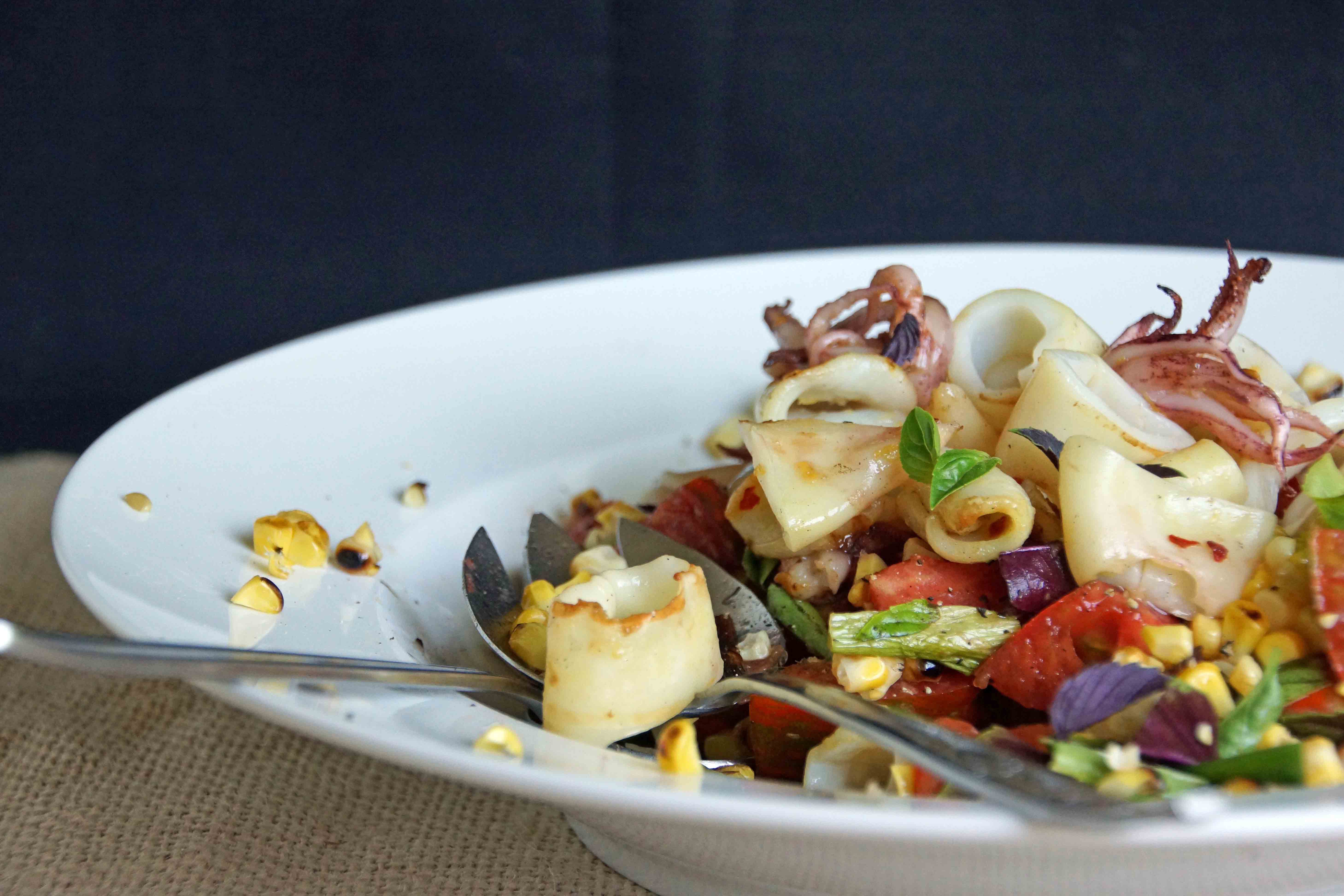 Grilled Calamari with Corn, Tomato & Basil Salad August 22, 2013 | posted by Sarah | Leave a Comment squid, heirloom tomato, recipe Google+