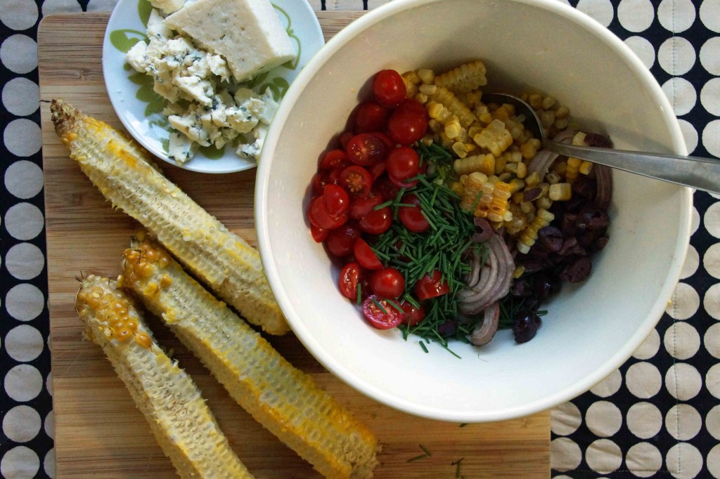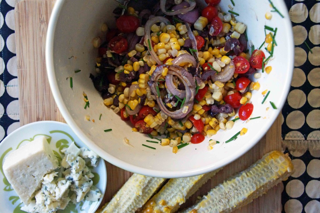 - When you are able to handle the corn, cut the kernels off the cobs and into a medium bowl. Combine with the grilled onions, sliced tomatoes, olives, and chives. Season with salt and pepper and dress with the olive oil and vinegar. Taste and adjust as needed.