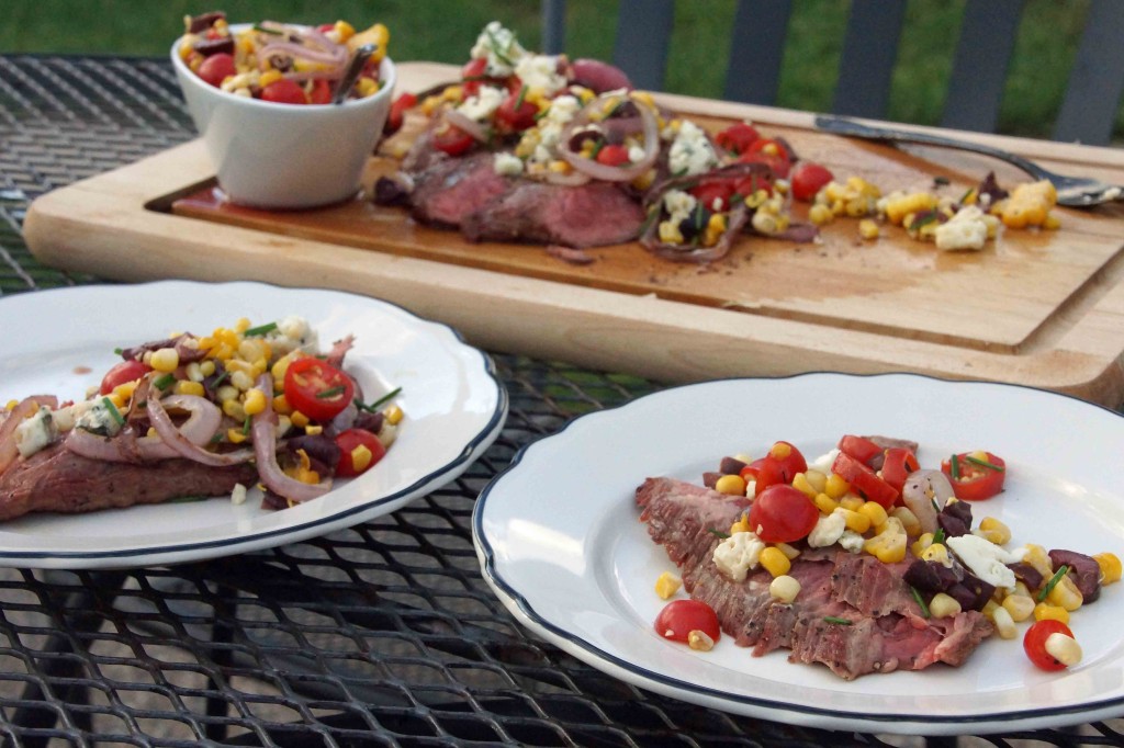 - Thinly slice the steak against the grain. Transfer to a serving platter, if desired, and top with about half of the corn relish. The remaining relish can be passed at the table. Scatter the blue cheese over the steak and serve.